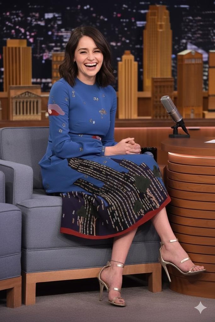 一幅电影级的写实访谈节目肖像,描绘了一位美丽的演员,她拥有一头浓密的栗色秀发,发型是柔和、富有光泽的波浪,略微偏分,脸上挂着明亮、温暖、富有感染力的笑容,散发出魅力和友善。她 Emilia Clarke 的灵感,但并非描绘真实人物。她自信地坐在《今夜秀》风格的布景中,与吉米·法伦(Jimmy Fallon)同台,坐在一张光滑的木质访谈桌后面,桌前摆放着专业的广播麦克风。 她身穿一件时尚优雅的蓝色连衣裙:修身的上衣以深海军蓝为底色,点缀着精致的金色星星图案,而飘逸的裙摆则展示着海军蓝、午夜蓝和柔和金色调的精致城市景观插画,裙边饰有精致的红色滚边。她搭配了一双金色细带高跟凉鞋,双腿自然交叉,姿态放松而自信。 她的表情充满喜悦和活力,捕捉到她正在大笑的瞬间,仿佛在回应一个幽默的评论,眼神富有表现力,妆容带有微妙的光泽,眉毛柔和分明,腮红自然,双唇水润。她的皮肤纹理高度逼真,光滑而自然,带有电影般的高光和阴影。 背景通过大型演播室窗户展示了夜间城市天际线,闪烁着散景灯光和霓虹灯反射,立刻让人联想到深夜访谈节目的氛围。演播室灯光专业且富有电影感:柔和的主光照亮她的脸庞,轻柔的轮廓光将她与背景区分开来,温暖的环境色调增强了舒适而迷人的电视节目氛围。 使用全画幅相机拍摄,85mm 镜头,浅景深,主体对焦超清晰,细节超写实,高动态范围,自然色彩分级,优质编辑摄影品质,8K 分辨率,现代好莱坞访谈节目美学。