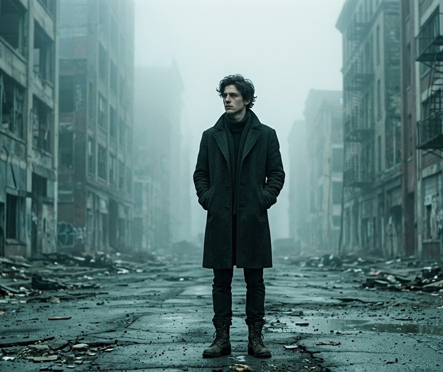 电影感全身城市肖像,年轻苗条的女子独自站在空旷的废墟城市街道中央,表情严肃而疏离,凌乱的波浪长发,穿着深色长风衣和围巾/高领,双手插兜,寒冷忧郁的氛围,浓雾和阴霾,低饱和度的青色/绿灰色调色板,两侧的高楼大厦形成一条走廊