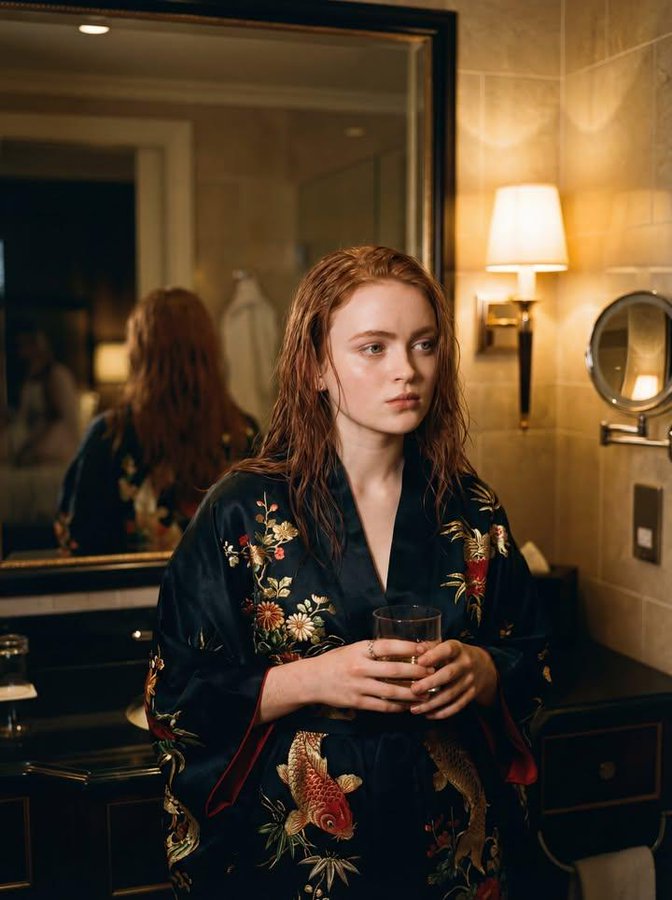 一张超电影感、弱光的肖像,完全保留参考照片中人物的面部特征。主体站在昏暗奢华的浴室里,背后的大镜子映出其柔和不抢镜的身影。他们身着深V领黑色丝绸和服浴袍,锁骨与上胸微露,袍上以金、红、暗绿三色精绣花卉与锦鲤。肌肤清透自然,神情平静内省,目光微侧,未直视镜头。手中握一只盛有液体的透明玻璃杯,姿态松弛。暖钨丝灯光、情绪化的阴影、电影感辉光与浅景深,整体氛围仿若高端时尚大片,带有东京酒店深夜静谧感。35mm胶片效果、f/1.8光圈、细腻颗粒、自然肤色、强烈对比、真实反射、轻微胶片噪点。照片级真实、超细节、高动态范围、专业时尚摄影、奢华编辑风格。