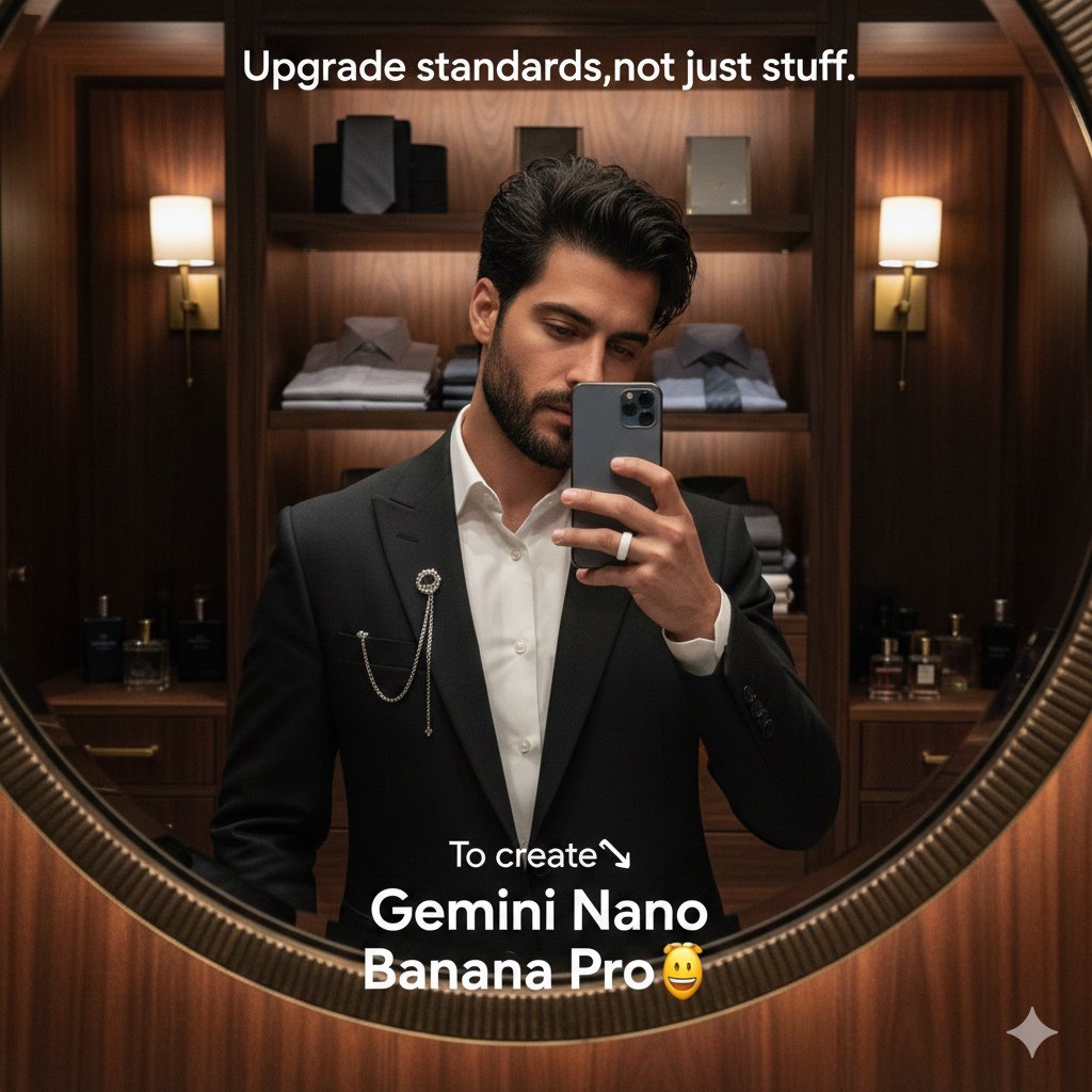 { subject:[ "identity": "Handsome young man with messy black hair and a well-groomed short beard", "pose": "party selfie, partially obscuring face with a slate-gray smartphone, looking down slightly", "expression": "Confident and calm" }, "attire": { "outerwear": "Tailored black blazer", "shirt": "Crisp white dress shirt, top button unbuttoned", "accessories": [ "Silver lapel pin with a delicate hanging chain", "Luxury shot/hotel", "Sleek white rings" ] }, "setting": { "location": "Luxurious walk-in closet", "elements": [ "Dark walnut wood paneling", "Shelves with folded shirts and silk gray ties", "Premium cologne bottles" ], "lighting": "Warm cinematic glow, LED, and gold wall sconces" }, "composition": { "framing": "Shot through a circular mirror with a textured rim", "style": "Photorealistic, editorial luxury lifestyle", "technical": "Shallow depth of field, sharp focus on subject, high-end digital photography" }, "camera": { "angle": "Eye-level", "lens": "85mm portrait lens", "settings": { "aperture": "f/1.8", "shutter_speed": "1/125s", "ISO": "200" } }, "mood": "Luxurious, confident, sophisticated", "output": { "resolution": "1024x1024", "format": "PNG", "style_strength": "high", "iterations": 1 } } }{ subject:[ "identity": "一位英俊的年轻男子,头发蓬乱,留着修剪整齐的短胡须", "pose": "派对自拍,用一块石板灰色的智能手机半遮住脸,略微向下看", "expression": "自信而平静" }, "attire": { "outerwear": "修身黑色西装外套", "shirt": "挺括的白色正装衬衫,最上面的纽扣未扣", "accessories": [ "带有精致垂链的银色翻领别针", "奢华的酒杯/酒店", "光滑的白色戒指" ] }, "setting": { "location": "豪华步入式衣帽间", "elements": [ "深色胡桃木镶板", "摆放着叠好的衬衫和丝质灰色领带的架子", "高档古龙水瓶" ], "lighting": "温暖的电影般光芒,LED 灯和金色壁灯" }, "composition": { "framing": "通过一个带有纹理边缘的 {argument name=\"mirror shape\" default=\"圆形\"} 镜子拍摄", "style": "超现实主义,编辑级奢华生活方式", "technical": "浅景深,主体对焦清晰,高端数码摄影" }, "camera": { "angle": "与视线齐平", "lens": "85mm 人像镜头", "settings": { "aperture": "f/1.8", "shutter_speed": "1/125s", "ISO": "200" } }, "mood": "奢华、自信、精致", "output": { "resolution": "1024x1024", "format": "PNG", "style_strength": "高", "iterations": 1 } } }