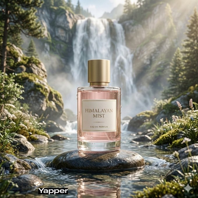 灯光是柔和的自然光混合着微妙的银幕光晕,在玻璃上产生光泽的高光,在湿石头上产生逼真的反射。干净的对称构图,瓶身焦点完美清晰,浅景深,水、石头、玻璃和叶子的纹理高度细节化。美学风格融合了豪华香水广告与空灵的自然幻想,色调以清新的绿色、柔和的中性色和晶莹剔透的水色调为主。照片级真实 8K 画质,超精细纹理,高级杂志质感,高动态范围,专业 85mm 镜头感。
