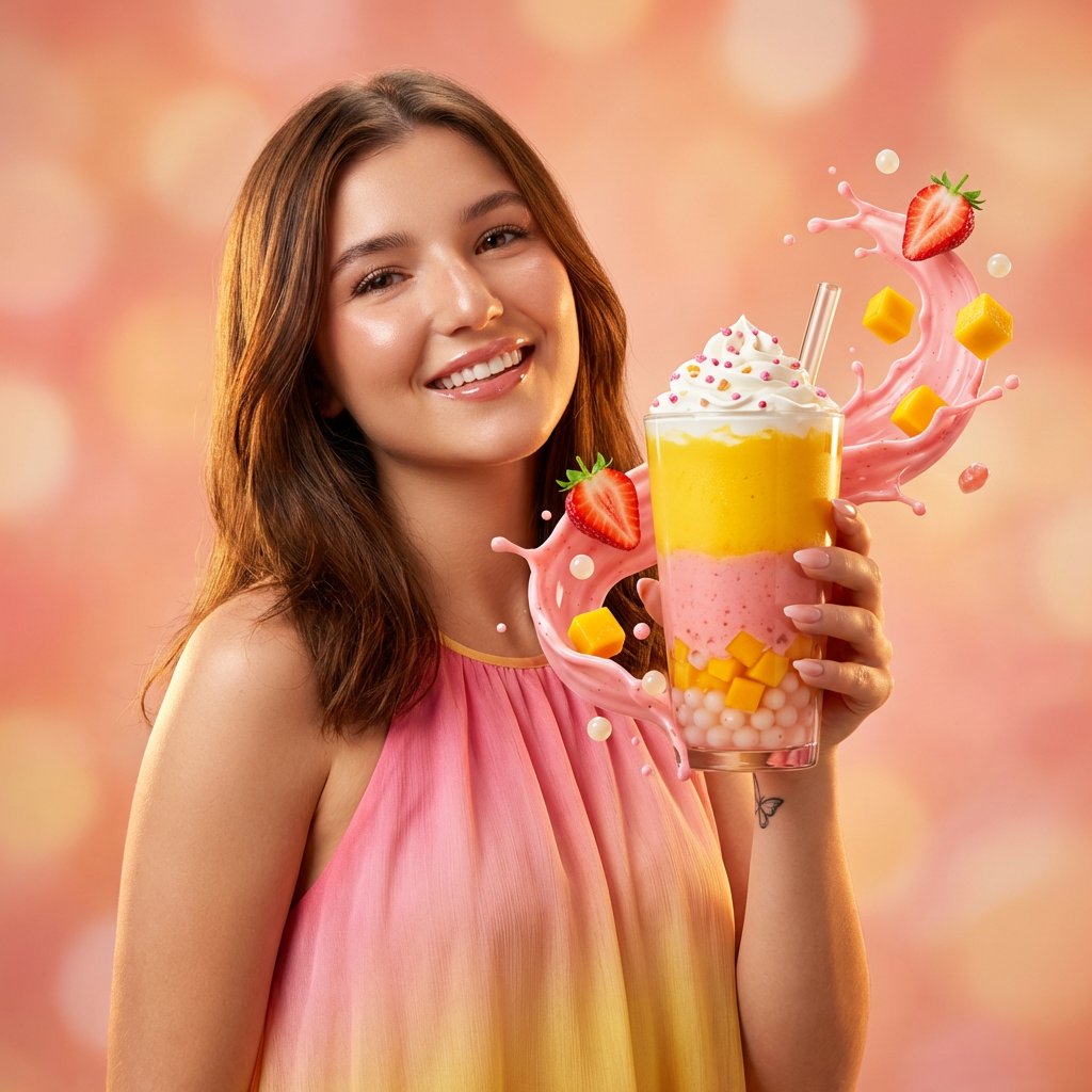 一张超逼真的、细节丰富的商业饮料广告照片,展示了一杯高大的透明玻璃杯,里面盛满了令人惊艳的分层芒果草莓冰沙珍珠奶茶。从底部到顶部是充满活力的渐变层:底部是半透明的粉色草莓层,里面有许多Q弹的白色木薯珍珠和芒果丁;中间是明亮阳光般的黄色芒果冰沙层;顶部是奶油状的白色鲜奶油泡沫,上面撒着微小的粉色和白色珍珠糖粒。粉色草莓液体呈戏剧性的漩涡状,在玻璃杯周围动态地旋转飞溅。新鲜的半颗草莓和金黄色的芒果块在空中飞舞,果汁液滴和水花四溅,珍珠在半空中悬浮。 一位美丽的西方年轻女性以广告姿势站在饮料旁边,皮肤散发着夏日的光泽,化着柔和自然的妆容,嘴唇水润有光泽,表情愉悦而清新,优雅地拿着玻璃杯。她穿着一件与芒果草莓色调相同的时尚夏日连衣裙——渐变的粉色和黄色连衣裙与冰沙的色调相得益彰。轻薄的面料微微飘动,仿佛在运动中被捕捉。现代商业饮料广告活动风格。 柔和的散景背景,带有温暖的桃粉橙色调,高对比度,鲜艳饱和的色彩,电影般的灯光,带有轮廓光和微妙的光晕,超清晰的焦点,8k,超现实主义,令人垂涎欲滴,清爽的夏日饮品广告活动,奢华品牌广告美学。--ar 3:4 --stylize 250 --v 6 --q 2