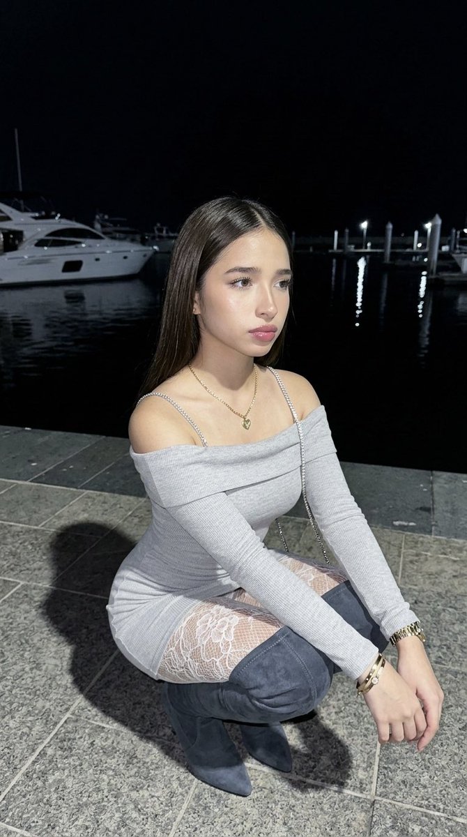 (9:16) Raw high-fidelity photo, high-angle medium shot. iPhone 17 Pro simulation, 24mm wide-angle, f/2.8, sharp subject focus, authentic digital grain. Scene: Subject fills ~65% of frame in crouching/kneeling pose. Upper 40% shows pitch-black night sky and dark marina water; lower 20% textured stone tile floor. Camera ~1.5m above subject angled downward. Identity Lock: Inherit ALL facial features from the provided selfie (face shape, bone structure, eyes, nose, lips, skin tone, hair). Photogenic Enhancements: Natural skin clarity with preserved texture, even tone, subtle luminosity, refined jawline shadows, gentle nasal highlight, soft cheekbone highlights, enhanced iris catchlights, natural lash separation, groomed brows, pearl-white teeth, salon-finish hair with controlled flyaways. Bio-fidelity with micro-pores, hydrated T-zone, faint vellus hair. Expression: Pensive neutral look. Gaze ~45° to mid-right off-camera. Slightly parted lips, relaxed brows, head tilted slightly right. Hair: Inherit color/texture from selfie. Long sleek straight hair with center part falling behind shoulders. Strong flash highlights creating strand separation. Makeup: Glossy pink lips, clean foundation, winged black eyeliner, defined lashes, soft blush. Accessories: Thin gold chain necklace with small heart pendant, crystal-studded silver strap across left shoulder, gold bracelets/watch on left wrist. Outfit: Light grey rib-knit off-shoulder mini dress with long sleeves. White floral-lace tights. Dark slate-grey suede thigh-high boots. Realistic fabric tension and elbow/waist bunching; detailed lace skin interaction. Defined S-curve silhouette with enhanced waist–hip and leg geometry. Pose: Torso and hips angled ~45° right. Head turned further right, looking off-camera. Low crouch on stone floor, arms relaxed forward with natural finger articulation. Mood: Moody urban nighttime aesthetic. Palette: slate grey, optic white, onyx black, pale gold. Lighting: Harsh direct flash (~6500K) from camera, bright skin highlights and deep shadows. High-contrast flash photography look. Environment: Night marina/waterfront — dark water with vertical dock light reflections, blurred white yacht mid-left, large textured grey stone tiles underfoot. Sharp subject shadows anchor to the ground.