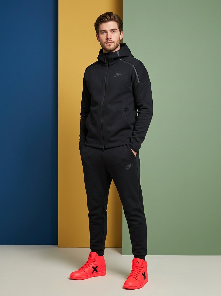 Make an image of man standing confidently against a plain, multiple coloured wall. He is wearing a premium matte black nike hooded tracksuit with subtle tonal grey logos on the chest and thigh. On his feet are striking, vibrant neon red jordan shoes with black x stripes. The lighting is bright and even, creating soft shadows, with a clean, high-fashion sportswear catalog aesthetic with a good pose.
