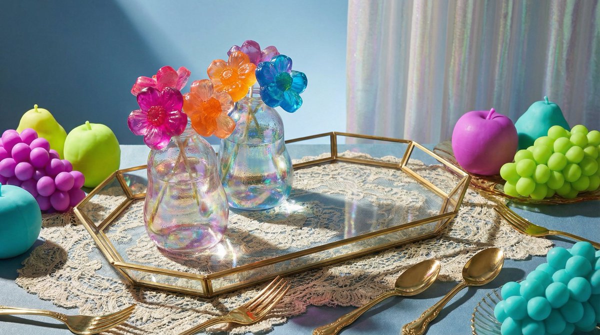 极繁主义桌面布置,特色包括:液态玻璃花瓶搭配果冻状花朵,蕾丝餐垫叠放在几何装饰艺术风格托盘下方,金属金色餐具在光线下熠熠生辉,橡胶质感水果呈现非自然的鲜艳色彩,酷蓝色渐变背景带有蛋白石般的光泽,超逼真的材质渲染展现每一个表面细节,戏剧性的单光源营造出强烈阴影,ASMR 般触感吸引力,升华的艺术品级产品摄影。