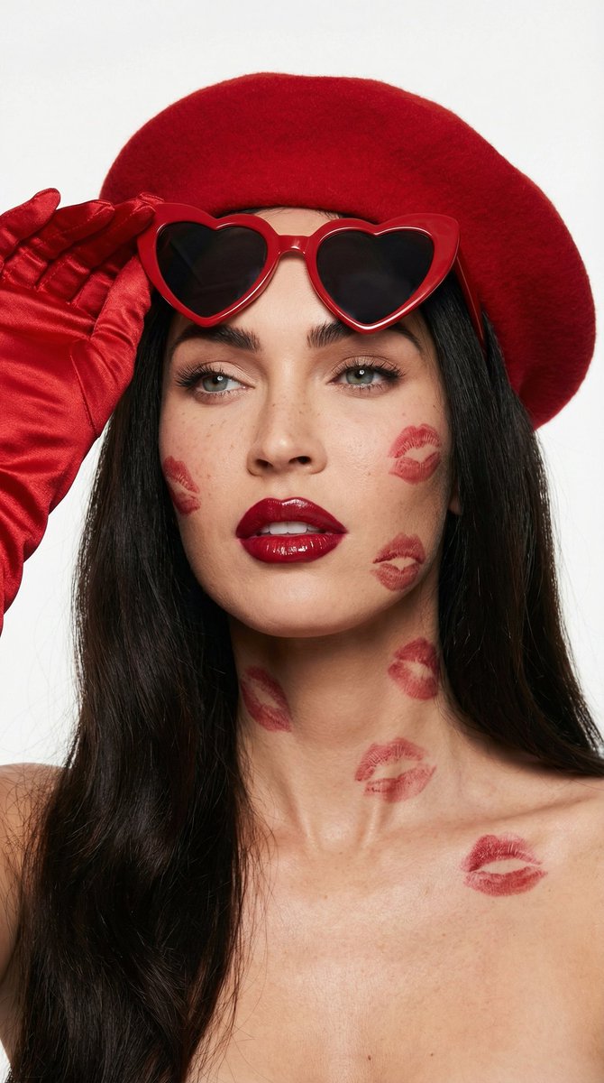 "description": "Confident and playful pose, Megan is slightly tilting her head, using her gloved hand to gently lift the heart-shaped sunglasses above her eyes, gazing intently past the camera lens with a bold expression",