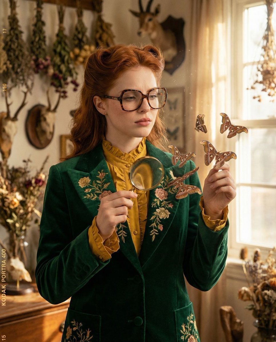 { "vibe_title_en": "Eclectic Metamorphosis", "master_prompt": "A hyper - realistic medium shot of a distinguished protagonist embodying 'The Melancholic Prodigy,' dressed in daring, Gucci - inspired high fashion with rich eclectic patterns and heavy velvet textures. The setting is a sun - drenched, dusty botanical curiosities study filled with dried herbs and antique taxidermy. The subject stands at a 45 - degree angle, head turned directly to the camera with a sorrowful, piercing focus. Surreal Element: The floral embroidery on the subject's lapel is physically peeling off the fabric, transforming into hyper - realistic, living atlas moths that flutter suspended in the air near their face. The subject's hand is raised, holding a vintage brass magnifying glass, inspecting the transformation with tactile curiosity. Lighting is warm and volumetric, highlighting swirling dust motes (Tyndall effect). Shot on a Hasselblad H6D - 100c with a 50mm lens, utilizing Kodak Portra 400 film emulation for creamy skin tones, organic grain, and a practical - effect aesthetic.", "meta": { "intent": "Editorial High Fashion with Surreal Narrative", "priorities": "Tactile Texture, Photorealistic Surrealism, Emotional Depth", "device_profile": "Hasselblad H6D - 100c" }, "frame": { "aspect": "4:5", "composition": "The Three - Quarter Editorial", "layout": "Mid - shot (Waist - up)", "camera_angle": "Eye - level", "tilt_roll_degrees": "0" }, "subject": { "gender": "Female", "identity": "The Melancholic Prodigy", "demographics": "Middle - aged, distinguished, sophisticated", "face": "Sorrowful focus, natural skin texture with visible pores and freckles, piercing gaze", "hair": "Styled with vintage volume, slightly tousled", "body": "45 - degree angle to camera, relaxed but poised", "expression": "Introspective melancholy mixed with focused curiosity", "pose": "One hand raised holding a magnifying glass near the chest, head turned to lens" }, "wardrobe_accessories": { "garments": [ { "item": "Structured Blazer", "material": "Heavy Velvet with Embroidery", "color": "Deep Emerald Green and Gold", "fit": "Tailored, Oversized Shoulders" }, { "item": "Silk Blouse", "material": "Silk", "color": "Mustard Yellow", "fit": "Loose, Ruffled Neck" } ], "accessories": [ { "item": "Oversized Spectacles", "color": "Tortoiseshell", "material": "Acetate", "brand_style": "Gucci Vintage" }, { "item": "Magnifying Glass", "color": "Brass", "material": "Metal and Glass", "brand_style": "Antique" } ] }, "environment": { "setting": "Botanical Curiosities Study", "surfaces": "Aged wood, dusty glass, velvet fabric", "depth": "Shallow depth of field blurring the cluttered background", "atmosphere": "Warm, du"{ "vibe_title_en": "Eclectic Metamorphosis", "master_prompt": "一幅超现实主义的中景照片,描绘了一位杰出的主人公,她化身为“忧郁的天才”,身着大胆的 Gucci 风格高级时装,服饰上点缀着丰富而兼收并蓄的图案和厚重的丝绒质感。场景设定在一个阳光普照、尘土飞扬的植物奇珍书房,里面摆满了干草药和古董动物标本。主人公以 45 度角站立,头部直接转向镜头,眼神忧郁而锐利。超现实元素:主人公翻领上的花卉刺绣正从布料上物理剥落,幻化成超现实的活体阿特拉斯蛾,在她的脸庞附近悬浮飞舞。主人公抬起一只手,拿着一个老式黄铜放大镜,以一种触觉上的好奇心审视着这场转变。灯光温暖而富有体积感,凸显了空气中旋转的尘埃微粒(丁达尔效应)。使用哈苏 H6D-100c 相机和 50mm 镜头拍摄,采用柯达 Portra 400 胶片模拟,以获得柔和的肤色、自然的颗粒感和实用特效美学。", "meta": { "intent": "带有超现实叙事的时尚大片", "priorities": "触觉质感、超现实摄影、情感深度", "device_profile": "Hasselblad H6D-100c" }, "frame": { "aspect": "4:5", "composition": "四分之三特写", "layout": "中景(齐腰)", "camera_angle": "平视", "tilt_roll_degrees": "0" }, "subject": { "gender": "女性", "identity": "忧郁的天才", "demographics": "中年,杰出,精致", "face": "忧郁的专注,自然的皮肤纹理,毛孔和雀斑可见,锐利的目光", "hair": "复古蓬松造型,略显凌乱", "body": "与相机呈 45 度角,放松而沉着", "expression": "内省的忧郁与专注的好奇心交织", "pose": "一只手抬起,在胸前拿着放大镜,头转向镜头" }, "wardrobe_accessories": { "garments": [ { "item": "结构化西装外套", "material": "厚重刺绣丝绒", "color": "{argument name=\"blazer color\" default=\"深祖母绿和金色\"}", "fit": "修身剪裁,超大肩部" }, { "item": "真丝衬衫", "material": "真丝", "color": "芥末黄", "fit": "宽松,荷叶边领口" } ], "accessories": [ { "item": "超大眼镜", "color": "玳瑁色", "material": "醋酸纤维", "brand_style": "Gucci 复古" }, { "item": "放大镜", "color": "黄铜色", "material": "金属和玻璃", "brand_style": "古董" } ] }, "environment": { "setting": "植物奇珍书房", "surfaces": "老旧木材,布满灰尘的玻璃,丝绒面料", "depth": "浅景深,模糊杂乱的背景", "atmosphere": "温暖,尘土飞扬,神秘" } }