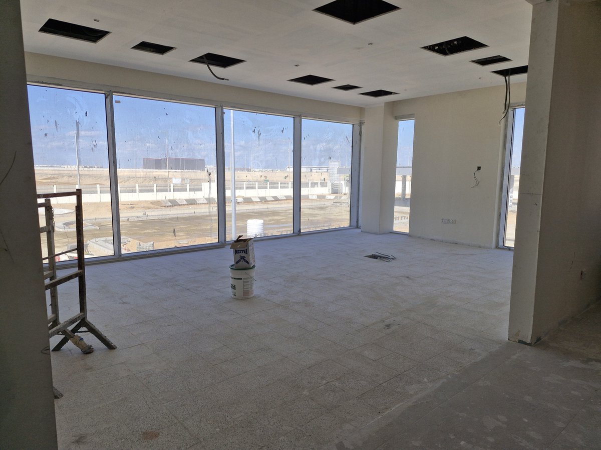 Please renovate this attached photo that showing a room under finishing work. Please complete this finishing work for this toom to be home office of Mercedes branch. Please renovate the ceilings, floor, windows, and wall professionally. Decorate this main office room to be suitable for 2026 modern design. Add cupboards, chairs, sofa, main office table with chair.