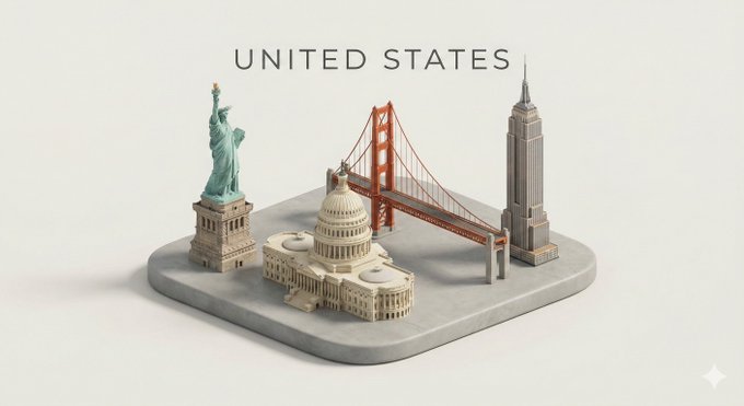 一个干净、极简的3D等距立体透视模型,展示了来自[国家名称]的精选标志性地标集合,被安排成一个连贯的微型建筑群。每个地标都经过精心简化与风格化,同时保持瞬间可识别性,并通过一致的尺度、几何形状与克制的材质调色板实现统一。