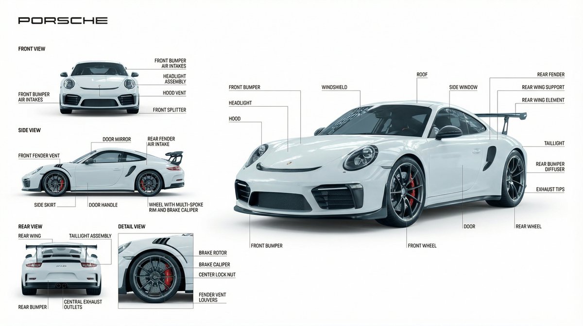 请使用上传图片作为唯一事实来源。 请勿推测型号、规格或性能。 纯白色、无干扰的背景。 左上角:PORSCHE(现代无衬线字体)。 左栏:辅助视图 (前视图 / 侧视图 / 后视图 / 细节图)。 右侧:大型逼真主渲染图。 仅对可见内容进行视觉分析。 识别独特的物理组件。 使用极细的矢量线标注每个组件。 仅使用中立、事实性术语。 无营销语言。 无臆想功能。 无假定性能。 斯堪的纳维亚风格、现代、工业文档风格。 柔和的影棚灯光。 超高分辨率。 精确的比例和几何保真度。