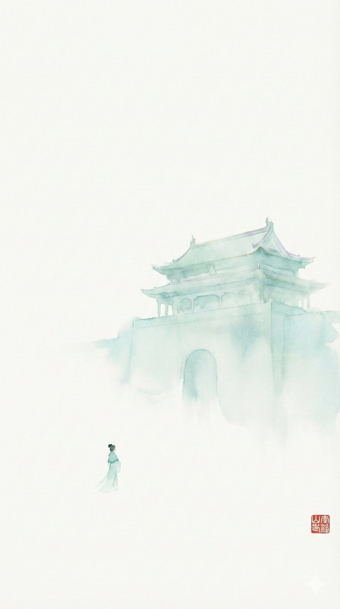 一幅极简广角宋代风格绘画,严格遵循“少即是多”理念。构图以大片纯冷白色宣纸表现无垠虚空。数名宋代女子背身起舞,仅由极淡、极度稀释、湿中湿晕染的冷青玉色与青绿墨色暗示身形与飘逸衣袂,墨色在吸水性纸纹中轻柔晕开,似舞云或流水而非实体。无硬干轮廓或色块。墨色具微妙微晶闪光,如研矿物颜料映环境光。极细发丝宽金属金与柔薰衣草紫线描舞袖与飘带动态边缘。极静、雅动、空灵逸致、冷温。**右下角一方传统中国朱红印,四字“只此青绿”,以典型高度风格化宋代“九叠篆”刻成,笔画繁复回环,几何填满方格。** --ar 9:16
