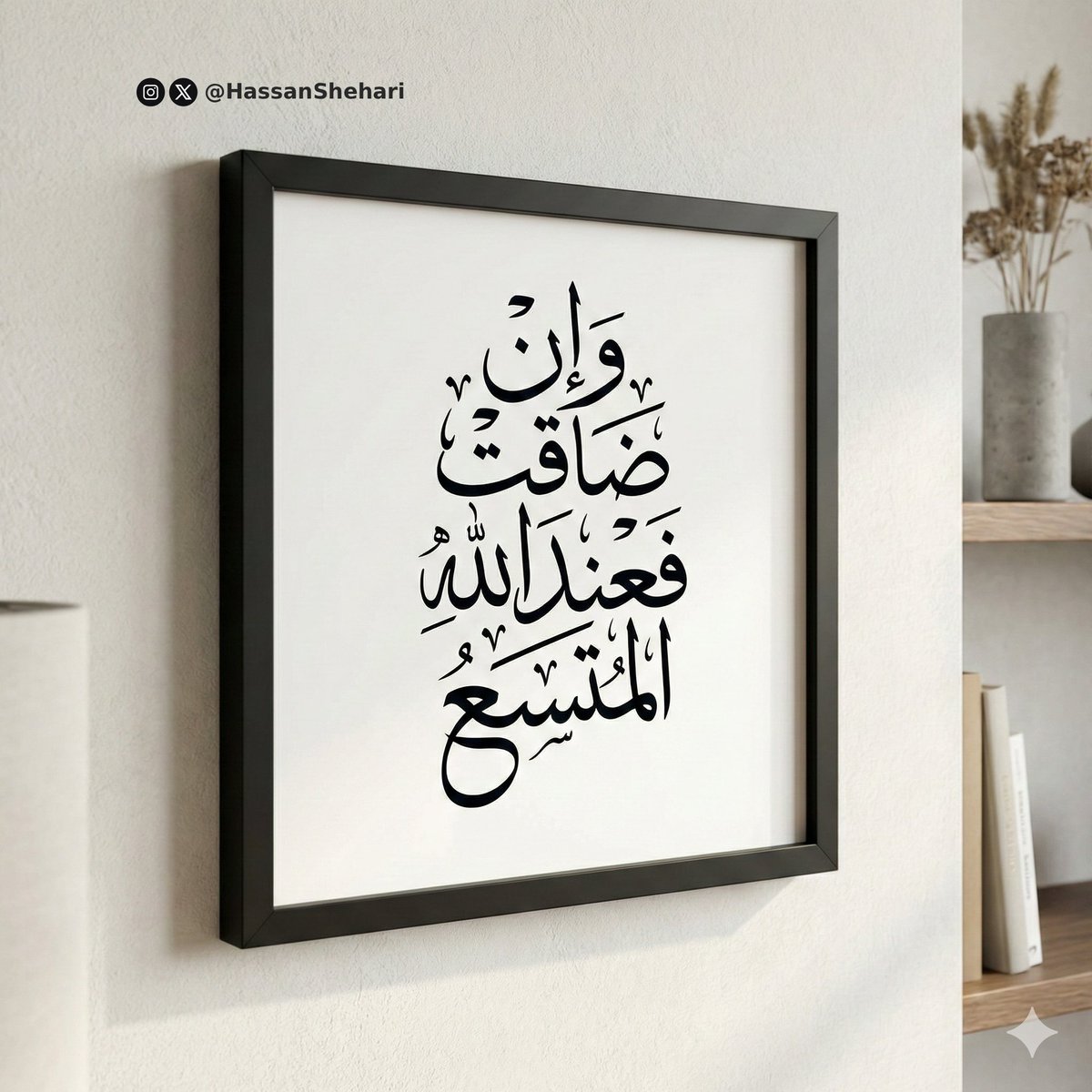 优雅的阿拉伯书法,书写着阿拉伯语文本“Write the text here”,黑色墨水风格,带有优雅的音符,现代伊斯兰书法,垂直构图,艺术曲线,极简白色背景,高对比度,华丽的阿拉伯排版,矢量风格,简洁设计。干净的白色背景,高对比度。艺术品置于一个简单的哑光黑色方框画框内,逼真的壁挂式画框,柔和的摄影棚灯光,微妙的墙壁阴影,现代室内美学,高分辨率,清晰细节,照片级真实感模型。1:1