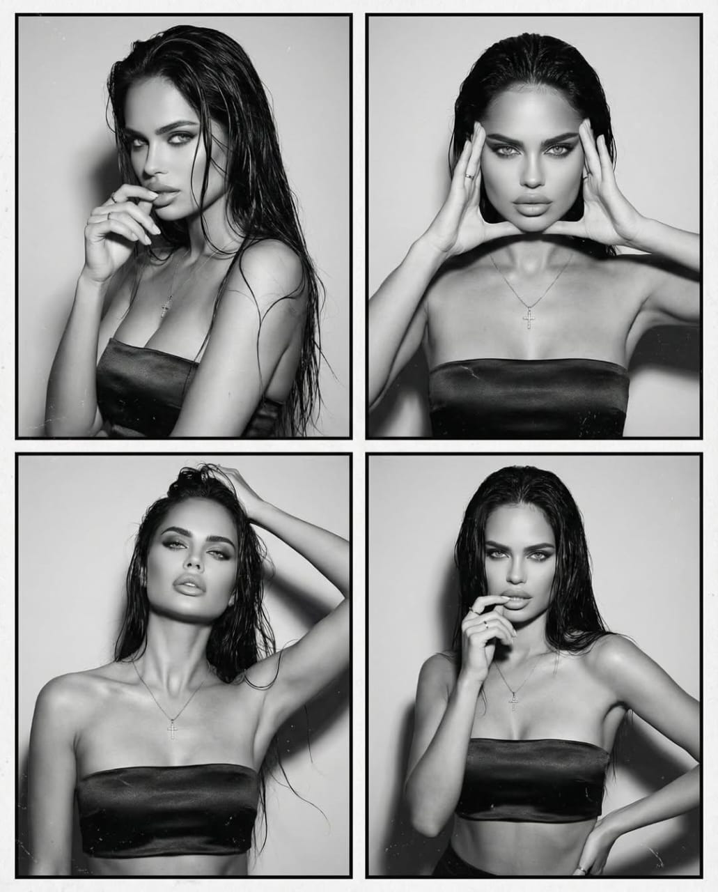 "prompt": "High-fashion black and white editorial photo collage featuring a glamorous young woman with wet, slicked-back dark hair. Four separate portrait frames arranged in a clean grid layout, each frame showing a different confident pose and facial expression. The model is wearing a minimal black strapless bandeau top with subtle jewelry, including a delicate cross necklace. Strong eye contact, sculpted cheekbones, full lips. Dramatic high-contrast lighting with cinematic shadows. Poses include hands framing the face, fingers near lips, hand in hair, and a relaxed confident stance. Clean studio background, monochrome aesthetic, Vogue-style luxury fashion editorial photography, sharp focus, timeless mood, ultra-realistic, high resolution, professional magazine photoshoot.",