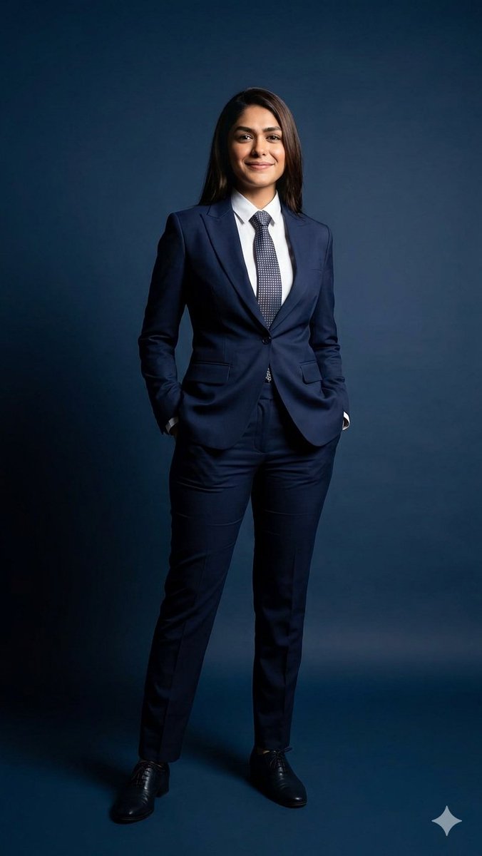 Create a picture of business woman wearing a deep navy blue slim-fit suit with a crisp white shirt and patterned tie, positioned against a smooth monochromatic navy background. Soft cinematic side lighting, dramatic shadows, wide-angle framing, 8K resolution, full body shot.