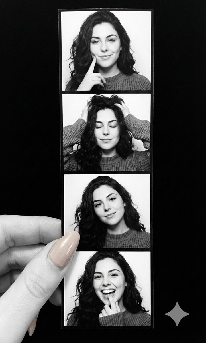 一只肤色白皙的手,留着长长的裸色指甲,手持一张垂直的四格黑白大头照,背景为纯黑色。这张照片是高分辨率的特写,具有逼真的摄影效果。手部色彩饱满,光线明亮自然,与单色大头照柔和的影棚灯光形成对比。照片中的年轻女子留着深色卷发,摆出四个俏皮的姿势:戳脸颊、闭眼用手拨弄头发、头微倾温柔微笑、以及触摸嘴唇开怀大笑。前景:一只手,留着长长的杏仁形裸色美甲,握住照片条的左下角。整体氛围真诚而怀旧,光面相纸、纹理分明的头发和光滑的指甲都呈现出高度精细的质感。