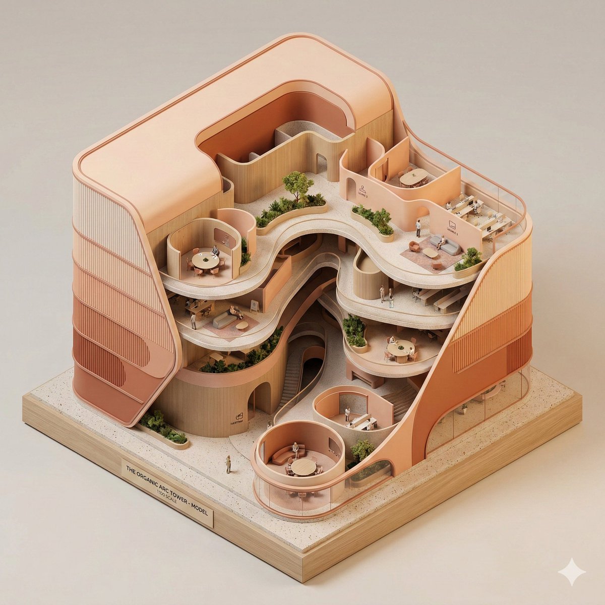 一个有机形态企业办公大楼的概念性建筑等距模型,以展览规模的立体模型呈现。该建筑展示了一个剖面,从自上而下的等距视角展现了流畅的空间流动、弧形会议室和休息区划分。体量由无缝弯曲的半透明隔断轻轻分隔,以暗示流线和功能。温暖的微型 LED 从内部照亮各个楼层。大量使用负空间和清晰的构图层次。纤细的结构轮廓,柔和的淡紫色和薄荷色,带肋木材和深色水磨石色调,极简抽象标牌,微妙的人体尺度标记。光滑的表面,药丸状的圆角边缘,富有戏剧性的受控工作室照明,建筑模型摄影风格,干净的深色中性背景,高细节但极简。