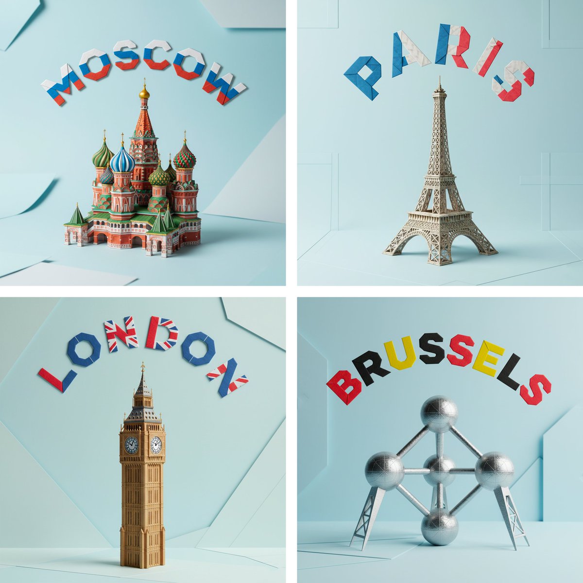 一张正方形1:1格式的数码照片,呈现一座以纹理彩色纸折叠而成的精致折纸模型(MONUMENT),居中构图。在其上方,用该国家象征色彩的鲜艳纸张折叠成醒目的折纸风格字母,拼写出(CITY)一词,并以优雅的弧形排列。背景柔和极简,采用浅粉彩或中性色调,带有细腻的纸张纹理或抽象几何细节。光线柔和漫射,投下自然阴影,强化每一个折痕的深度与锐度。整体风格干净、写实且富有手工质感,突出材质纹理、几何精度与视觉和谐。