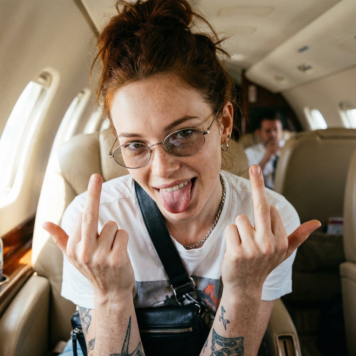 "Ultra-realistic raw DSLR paparazzi-style cinematic portrait of a young woman from the reference image — shot inside a beige leather private jet cabin. Tight waist-up crop, very close camera distance, slightly high-angle perspective, as if captured quickly from the aisle in a candid moment. The subject leans forward casually, torso angled slightly left, head tilted subtly right.Her expression is unapologetically playful and rebellious: a wide grin with tongue fully out, teeth exposed, cheeks raised, jaw relaxed and loose. Eyes locked directly into the lens through thin oval metal-frame glasses with lightly tinted lenses; eyes in razor-sharp focus while everything else falls off naturally. Both hands lifted near the chest, elbows bent, palms inward, clearly flipping both middle fingers toward the camera in a spontaneous, unfiltered gesture. Hair appears natural and unstyled, without emphasis on length, color, or shape — no idealization or aesthetic exaggeration. Skin is fully realistic and unretouched: natural tone variations, visible pores, fine lines, micro-imperfections, slight oil sheen, authentic highlights on the forehead and nose, organic shadow transitions — absolutely no smoothing, beauty filters, or artificial skin effects. She wears a white graphic T-shirt, a black leather cross-body bag strap hanging naturally across the torso, a silver chain necklace, and a small hoop earring. Tattooed forearms are clearly visible with authentic ink texture, slight skin stretch, and real pigment absorption. Lighting is harsh natural cabin light from camera-left mixed with ambient overhead lighting, creating slightly uneven exposure, mild blown highlights, gritty contrast, and natural shadowing under the cheekbones and jawline. Background shows blurred beige jet seats and indistinct figures, shallow depth of field with imperfect focus falloff and organic lens blur. DSLR look, paparazzi candid energy, subtle grain, imperfect framing, real-world color cast, film-like RAW processing, HDR realism, non-AI aesthetic, natural proportions, documentary-style authenticity."