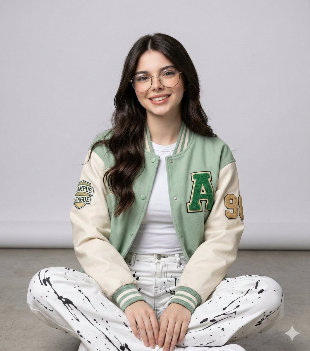 一位面带微笑的年轻女子,留着波浪状的深棕色长发,盘腿坐在浅灰色地板上,背景是柔和的纯灰色。她身穿一件带有字母贴片的淡绿色和白色校队夹克,白色修身 T 恤,以及带有抽象黑色泼墨图案的宽松白色长裤。姿势随意放松,妆容自然,表情温暖友善,工作室灯光柔和均匀,阴影极少,呈现出干净现代的美感。这是一张高分辨率时尚摄影作品,对焦锐利,使用 85mm 镜头,专业工作室设置,中性色彩分级。