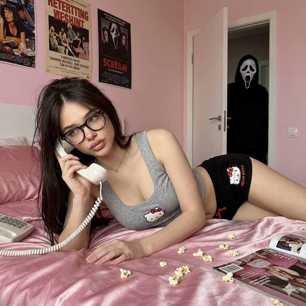 { "meta": { "width": 1200, "height": 1200, "aspect_ratio": "1:1", "version": "1.0" }, "scene_composition": { "subject": { "demographics": "Young woman, unspecified ethnicity", "physical_attributes": { "hair": "Long black hair, natural texture, slight messy volume", "skin": "Natural realistic texture, visible pores and minor imperfections, non-airbrushed", "makeup": { "style": "Soft glam, pink tones", "details": [ "smooth blush", "soft eyeliner", "defined lashes", "natural glossy lips" ] } }, "pose": { "body": "Lying on stomach on bed, upper body propped on forearms", "head": "Tilted slightly to the side", "expression": "Soft, calm, relaxed gaze", "action": "Holding vintage handset phone to ear" } }, "wardrobe": { "aesthetic": "Cute homewear / pajama style", "items": { "top": "Grey Hello Kitty tank top, small frill trim, bow detail", "bottom": "Black Hello Kitty shorts, pink drawstring, printed graphic" } }, "environment": { "foreground": { "location": "Bed", "textiles": "Soft pink satin sheets and pillows, slightly wrinkled", "scatter_items": [ "Vintage magazines", "Popcorn pieces" ], "props": "Vintage-style white handheld telephone with coiled cord" }, "background": { "walls": "Soft light pink", "decor": "Retro posters", "architectural": "White door, partially open", "narrative_element": "Dark figure wearing a Scream mask standing in the open doorway", "ambience": "Darker hallway behind the door creating contrast" } } }, "technical_specifications": { "camera_gear": "iPhone 16 Pro Max emulation", "lens_perspective": "Front-facing or close-range low angle", "lighting": { "type": "Natural indoor ambient", "quality": "Soft, even illumination on subject", "shadows": "Natural, no harsh flash" }, "visual_style": { "quality": "Slightly soft realism, not HD, phone photography aesthetic", "processing": "Unedited look, raw feel, natural color profile", "filters": "None" } }, "generated_prompt_string": "A realistic phone photo of a young woman lying on her stomach on a bed with pink satin sheets, wearing a grey Hello Kitty tank top and black shorts. She is holding a white vintage telephone to her ear. Messy long black hair, soft pink makeup, natural skin texture. The bed is scattered with magazines and popcorn. In the background, an open door reveals a dark figure wearing a Scream mask standing in the shadows. Shot on iPhone 16 Pro Max, flash off, soft natural lighting, low angle, unedited aesthetic." }json { "meta": { "width": 1200, "height": 1200, "aspect_ratio": "1:1", "version": "1.0" }, "scene_composition": { "subject": { "demographics": "年轻女性,种族不详", "physical_attributes": { "hair": "黑色长发,自然发质,略显蓬松凌乱", "skin": "自然真实的肤质,毛孔和细微瑕疵可见,未经修饰", "makeup": { "style": "柔和魅力妆,粉色调", "details": [ "柔滑腮红", "柔和眼线", "睫毛分明", "自然光泽唇" ] } }, "pose": { "body": "趴在床上,上半身用前臂支撑", "head": "头部略微侧倾", "expression": "柔和、平静、放松的眼神", "action": "手持复古听筒电话贴耳" } }, "wardrobe": { "aesthetic": "可爱家居服 / 睡衣风格", "items": { "top": "灰色 Hello Kitty 背心,小荷叶边饰边,蝴蝶结细节", "bottom": "黑色 Hello Kitty 短裤,粉色抽绳,印花图案" } }, "environment": { "foreground": { "location": "床", "textiles": "柔软的粉色缎面床单和枕头,略有褶皱", "scatter_items": [ "复古杂志", "爆米花碎屑" ], "props": "复古风格的白色手持电话,带卷曲电话线" }, "background": { "walls": "柔和的浅粉色", "decor": "复古海报", "architectural": "白色门,半开", "narrative_element": "一个戴着《惊声尖叫》面具的黑暗身影站在敞开的门口", "ambience": "门后较暗的走廊形成对比" } } }, "technical_specifications": { "camera_gear": "iPhone 16 Pro Max 模拟", "lens_perspective": "前置或近距离低角度", "lighting": { "type": "自然室内环境光", "quality": "主体光线柔和均匀", "shadows": "自然阴影,无刺眼闪光" }, "visual_style": { "quality": "略带柔和的写实感,非高清,手机摄影美学", "processing": "未经编辑的外观,原始质感,自然色彩配置文件", "filters": "无" } }, "generated_prompt_string": "一张逼真的手机照片,一名年轻女子趴在铺有粉色缎面床单的床上,身穿灰色 Hello Kitty 背心和黑色短裤。她手持白色复古电话贴耳。凌乱的黑色长发,柔和的粉色妆容,自然的肤质。床上散落着杂志和爆米花。背景中,一扇敞开的门露出一个戴着《惊声尖叫》面具的黑暗身影站在阴影中。使用 iPhone 16 Pro Max 拍摄,闪光灯关闭,柔和自然光线,低角度,未经编辑的美学风格。" }