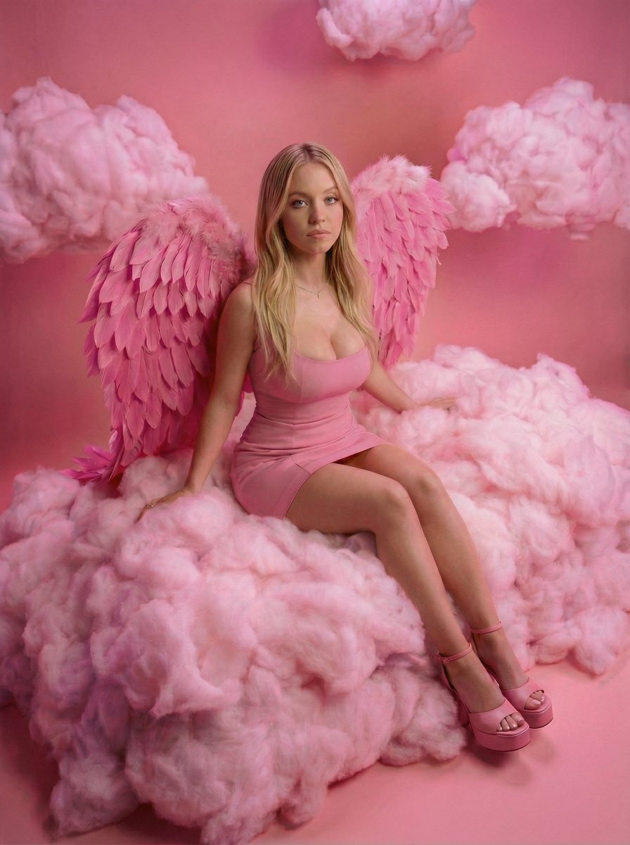 { "subject": { "description": "WOMAN FROM THE UPLOADED PHOTO FACE NOT TO BE CHANGED", "pose": "SEATED", "shot_type": "FULL BODY SHOT", "angle": "HIGH ANGLE CENTERED, HIGH ANGLE SHOT", "lens": "WIDE LENS", "focus": "SHALLOW DEPTH OF FIELD FOCUS ON THE WOMAN AND IMMEDIATE SURROUNDINGS", "eyes": "WOMAN'S EYES ARE CLOSED, WOMAN WITH CLOSED EYES", "hair": "LONG STRAIGHT DARK HAIR, WITH LONG HAIR", "skin": "FAIR SKIN" }, "wings": { "type": "LARGE, LAYERED, BRIGHT PINK WINGS", "style": "LARGE BRIGHT PINK FEATHERED WINGS", "visibility": "UPPER PART OF LARGE PINK WINGS", "material": "FABRIC (WINGS)" }, "clothing": { "outfit": "PINK MINI DRESS OR TOP, PINK MINI DRESS OR TOR", "shoes": "PINK PLATFORM HIGH HEELS, PINK PLATFORM OPEN TOE SANDALS WITH ANKLE STRAPS", "accessories": "DELICATE NECKLACE", "materials": "SYNTHETIC LEATHER/PLASTIC (SHOES), METAL (NECKLACE)" }, "makeup": { "style": "PINK MAKEUP", "eyes": "PINK EYESHADOW WITH GLITTER", "lips": "PINK LIPSTICK" }, "environment": { "setting": "STUDIO SET WITH PINK BACKGROUND AND ARTIFICIAL CLOUDS", "background": "BACKGROUND SOLID PINK WALL, SOLID PINK BACKGROUND", "clouds": "PINK ARTIFICIAL CLOUDS", "clouds_material": "SYNTHETIC FOAM/COTTON (CLOUDS)", "platform": "PINK ARTIFICIAL CLOUDS", "foreground": "FOREGROUND WOMAN'S LEGS AND FEET WITH PINK HEELS" }, "lighting": { "type": "SOFT, EVEN STUDIO LIGHTING", "ambient": "PINK AMBIENT LIGHT" }, "color_grading": { "style": "CINEMATIC COLOR GRADING (PINK DOMINANT)", "skin": "SOFT FOCUS ON SKIN", "saturation": "HIGH SATURATION" } }{ "subject": { "description": "上传照片中的女性面部不作改动", "pose": "坐姿", "shot_type": "全身照", "angle": "高角度居中,高角度拍摄", "lens": "广角镜头", "focus": "景深较浅,聚焦于女性及其周围环境", "eyes": "女性闭着眼睛,闭眼女性", "hair": "长直深色头发,长发", "skin": "白皙皮肤" }, "wings": { "type": "大型、多层、亮粉色翅膀", "style": "大型亮粉色羽毛翅膀", "visibility": "大型粉色翅膀的上半部分", "material": "织物(翅膀)" }, "clothing": { "outfit": "粉色迷你连衣裙或上衣,粉色迷你连衣裙或上装", "shoes": "粉色厚底高跟鞋,粉色厚底露趾凉鞋带踝带", "accessories": "精致项链", "materials": "合成皮革/塑料(鞋),金属(项链)" }, "makeup": { "style": "粉色妆容", "eyes": "带闪粉的粉色眼影", "lips": "粉色口红" }, "environment": { "setting": "带粉色背景和人造云朵的影棚布景", "background": "背景纯粉色墙壁,纯粉色背景", "clouds": "粉色人造云朵", "clouds_material": "合成泡沫/棉(云朵)", "platform": "粉色人造云朵", "foreground": "前景是女性的腿和脚,穿着粉色高跟鞋" }, "lighting": { "type": "柔和、均匀的影棚灯光", "ambient": "粉色环境光" }, "color_grading": { "style": "电影级调色(粉色为主)", "skin": "皮肤柔焦", "saturation": "高饱和度" } }