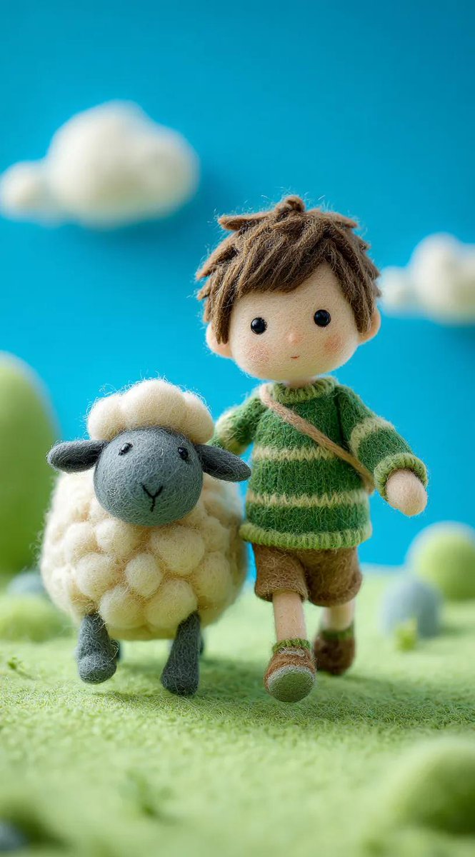 a cute little boy, walking with his pet [OBJECT ] on the green grass of an amusement park, in the style of pixar's animation style, with needle felting, against a blue background with white and sky-blue accents, in a simple style, showing a full-body shot, conveying a sense of childlike innocence and charm, with soft edges and blurred details, in an isometric, minimalist illustration, depicting a minimalist scene --ar 71:128