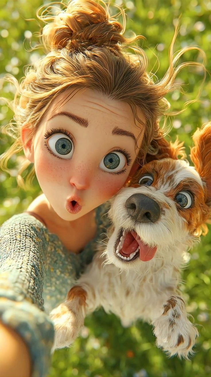 一个可爱的皮克斯风格3D动画女孩在户外与她那顽皮的小狗近距离自拍。女孩有一双大大的表情丰富的眼睛,脸颊上有雀斑,皮肤柔软红润,浅棕色头发扎成凌乱的发髻,做出惊讶的“O”形嘴表情。狗是一只小型梗犬,毛色为白色和棕色,舌头伸出,快乐而充满活力。明亮的自然阳光,柔和的黄金时段光线,浅景深,绿色草地背景带有散景。超精细的毛发和皮肤纹理,电影般构图,鲜艳的色彩,健康快乐的氛围,高分辨率,3D卡通写实风格,皮克斯-迪士尼动画风格。