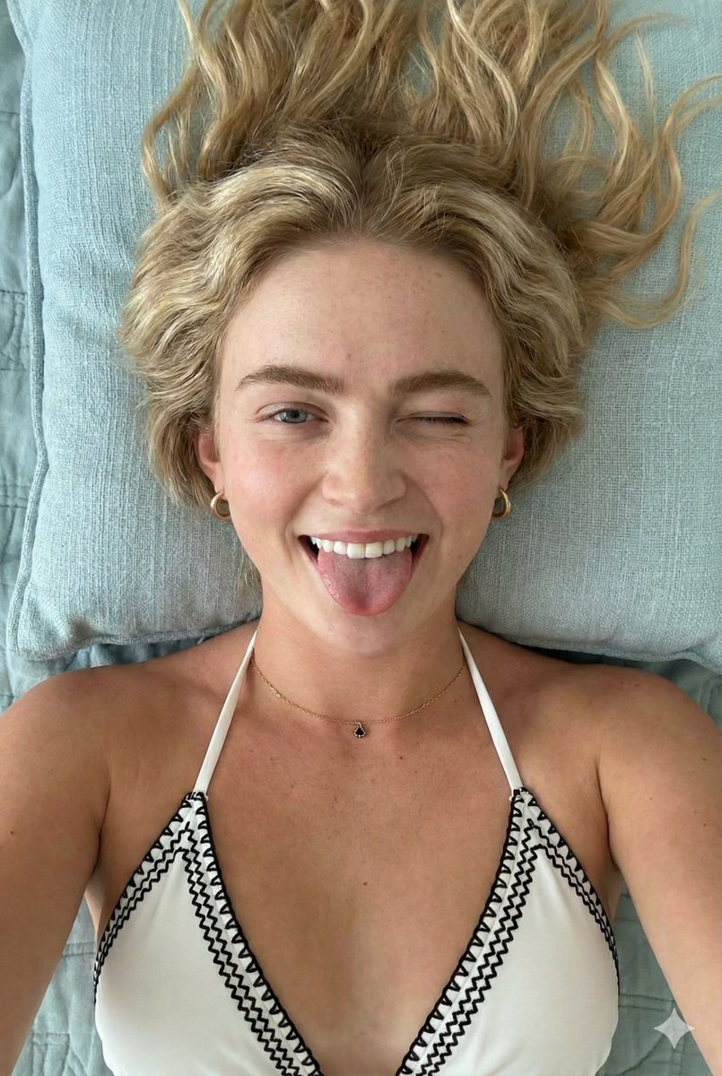 { "aspect_ratio": "2:3", "subject": { "type": "Woman", "age": 19, "position": "Lying on back, overhead view" }, "expression": { "action": "Winking right eye, sticking out tongue", "smile": "Broad, showing teeth", "nose": "Wrinkled" }, "features": { "skin_tone": "Fair with visible freckles on cheeks and nose", "cheeks": "Flushed pink", "lips": "Natural pink, tongue extended", "eyes": "Left brown eye open, right winking", "hair": "Blonde, wavy, spread out above head" }, "attire": { "bikini_top": "White halter-neck with black embroidered zig-zag trim along edges" }, "accessories": { "earrings": "Small gold hoop earrings", "necklace": "Delicate gold chain with a small, dark charm" }, "environment": { "background": "Light blue textured fabric pillow and blanket", "lighting": "Soft, natural indoor light" } }{ "aspect_ratio": "2:3", "subject": { "type": "女性", "age": 19, "position": "仰卧,俯视视角" }, "expression": { "action": "右眼眨眼,伸出舌头", "smile": "咧嘴大笑,露出牙齿", "nose": "鼻子皱起" }, "features": { "skin_tone": "白皙,脸颊和鼻子上可见雀斑", "cheeks": "脸颊泛红", "lips": "自然粉色,舌头伸出", "eyes": "左眼棕色睁开,右眼眨眼", "hair": "{argument name=\"hair color\" default=\"Blonde\"},波浪状,散开在头部上方" }, "attire": { "bikini_top": "{argument name=\"bikini color\" default=\"White\"} 挂脖比基尼上衣,边缘有黑色刺绣锯齿形饰边" }, "accessories": { "earrings": "小金色圈形耳环", "necklace": "精致的金色链条,带有一个小巧的深色吊坠" }, "environment": { "background": "浅蓝色纹理织物枕头和毯子", "lighting": "柔和的自然室内光线" } }