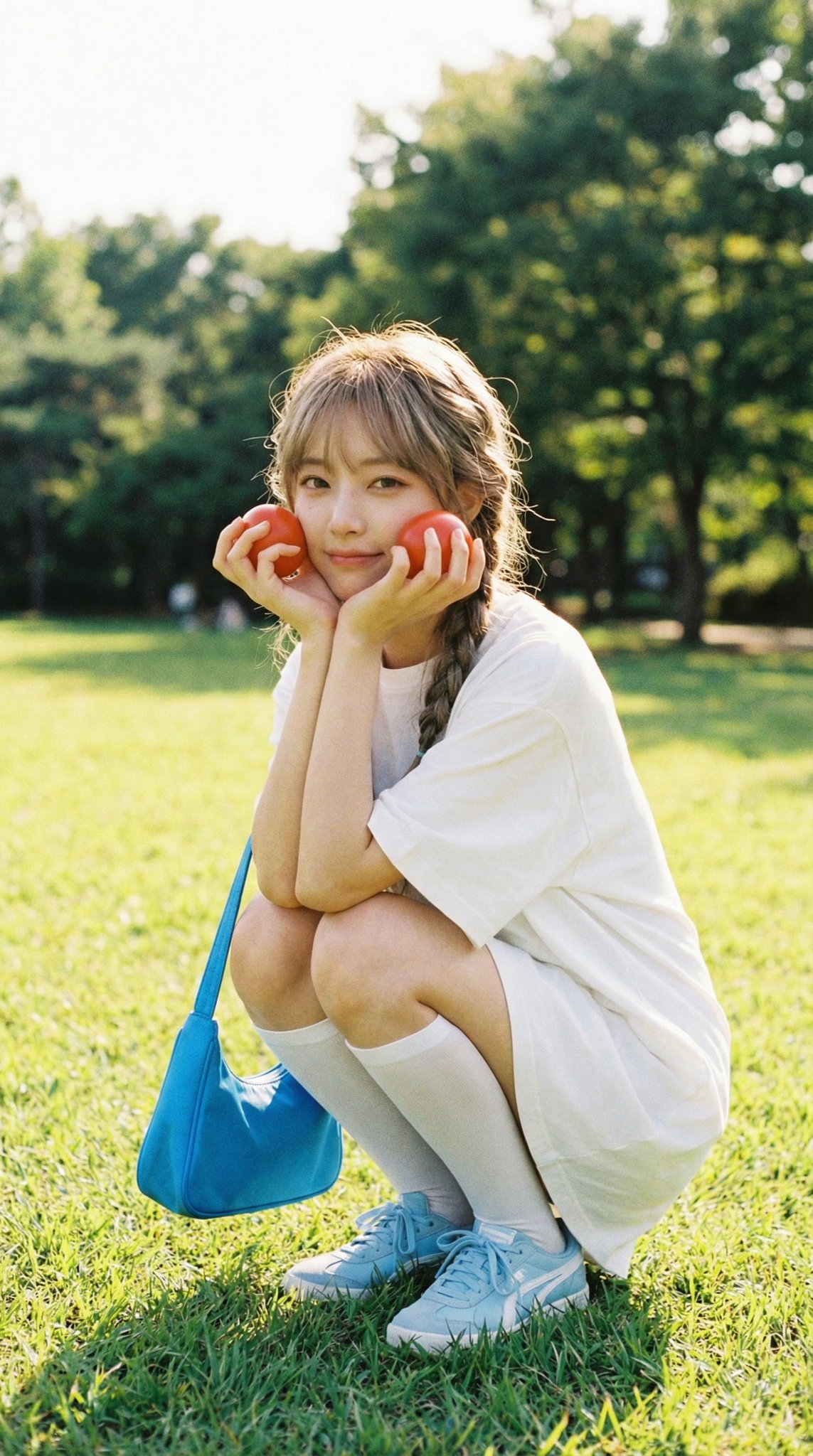 "subject": "Based on <User Portrait>, a young woman crouching on a park lawn, posing playfully. She is holding two fresh red tomatoes against her cheeks with both hands, elbows resting on her knees. She wears a white oversized t-shirt dress, white knee-high socks, and light blue sneakers. Her hair is styled in loose, slightly messy braids. A bright blue shoulder bag hangs by her side. In the background, there is a park scenery with trees and benches.",