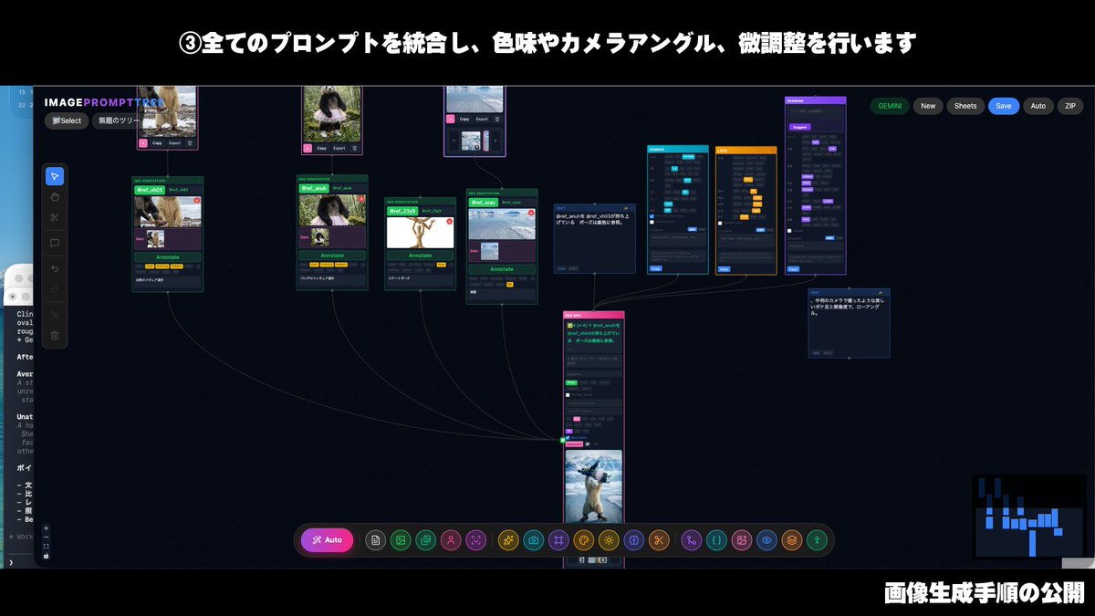 ① Create a "Polar Bear" and a "Panda" wearing ice skates, and the background location. Normal chat-based input is also OK. Whether you generate it all at once or separately, the process is the same. ② Perform annotation on the image. This is the most troublesome part, so I made it a tool. Based on the file name, I create a prompt that organizes "which part of which image to reference." (Pose / BG / Face / Clothing, etc.) ③ Add supplementary information such as composition and color scheme for the final generation.
