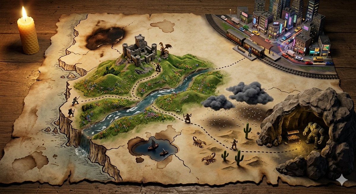 A hand-drawn treasure map on aged parchment, with the adventure erupting into three-dimensional quest. STARTING_POINT rises at the map's edge with DEPARTURE_SCENE, the dotted path becomes an actual trail traversing TERRAIN_1 with DANGER_1, passing {LANDMARK_1} where {OBSTACLE_1} awaits. {TERRAIN_2} features {WILDLIFE_1} and {ENVIRONMENTAL_HAZARD}. The X marking the spot glows beneath {FINAL_LOCATION}, treasure partially visible, {GUARDIAN_ELEMENT} protecting it. Miniature expedition party frozen mid-journey at various points along the route. Torn edges of the map become cliffs. Coffee stains become lakes. Burn marks become scorched earth from battles past. Candlelight flicker, adventure novel lighting, 8K, the map as the story it promises.一张绘制在陈旧羊皮纸上的手绘藏宝图,冒险以三维任务的形式展开。STARTING_POINT 在地图边缘升起,伴随着 DEPARTURE_SCENE,虚线路径变成了一条真实的轨迹,穿越 TERRAIN_1,伴随着 DANGER_1,经过 {LANDMARK_1},那里有 {OBSTACLE_1} 等待着。{TERRAIN_2} 呈现出 {WILDLIFE_1} 和 {ENVIRONMENTAL_HAZARD}。标记地点“X”在 {FINAL_LOCATION} 下方闪耀,宝藏若隐若现,由 {GUARDIAN_ELEMENT} 守护着。微型探险队在路线上的各个点凝固在旅途中。地图的撕裂边缘变成了悬崖。咖啡渍变成了湖泊。烧痕变成了过去战役中焦灼的土地。烛光闪烁,冒险小说般的灯光,8K,地图本身就是它所承诺的故事。