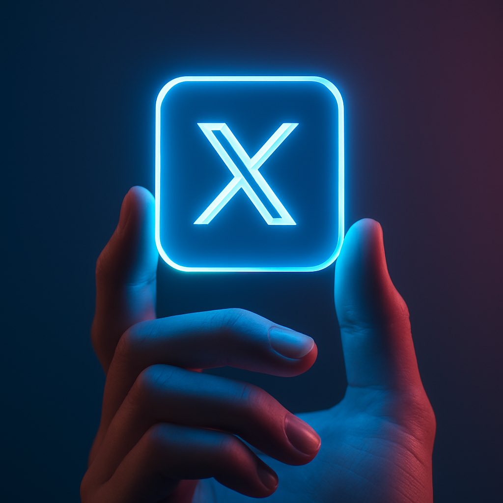 A close-up digital photo of a human hand gently holding a glowing neon blue square icon featuring the [LOGO NAME] logo, set against a smooth dark gradient background. The blue light from the icon softly illuminates the fingers, casting a futuristic glow. The background is minimal and blurred, emphasizing the icon and the hand. High detail, cinematic lighting, modern tech aesthetic.