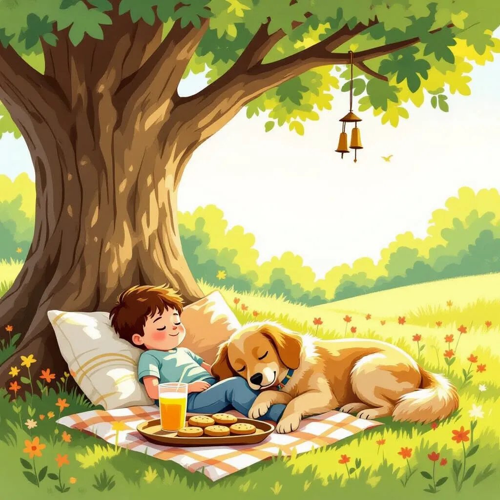 a pillow fort in the backyard, shaded by a big old tree. Sunlight filters through the leaves, and a young boy and his golden retriever naps beside a tray of lemonade and cookies. Wind chimes tinkle gently in the breeze. Warm afternoon light, playful and nostalgic, children's book illustrated feeling