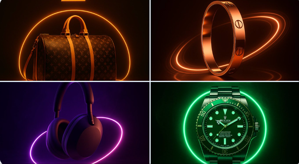 Create a cinematic advertisement for “[PRODUCT NAME]” — use bioluminescent neon lighting that matches the brand’s visual identity — place the product at the center of the scene with surreal, minimalistic composition — automatically adapt the environment to reflect the product’s nature (e.g. tech, fragrance, luxury, automotive, beauty) — integrate the brand’s actual logo in high fidelity — generate a short, powerful 3-word tagline that fits the brand’s tone — long exposure lighting effects — dramatic shadows — ultra-sharp focus — dark or ambient background — aspect ratio 2:3 or 1:1 — ultra-HD resolution