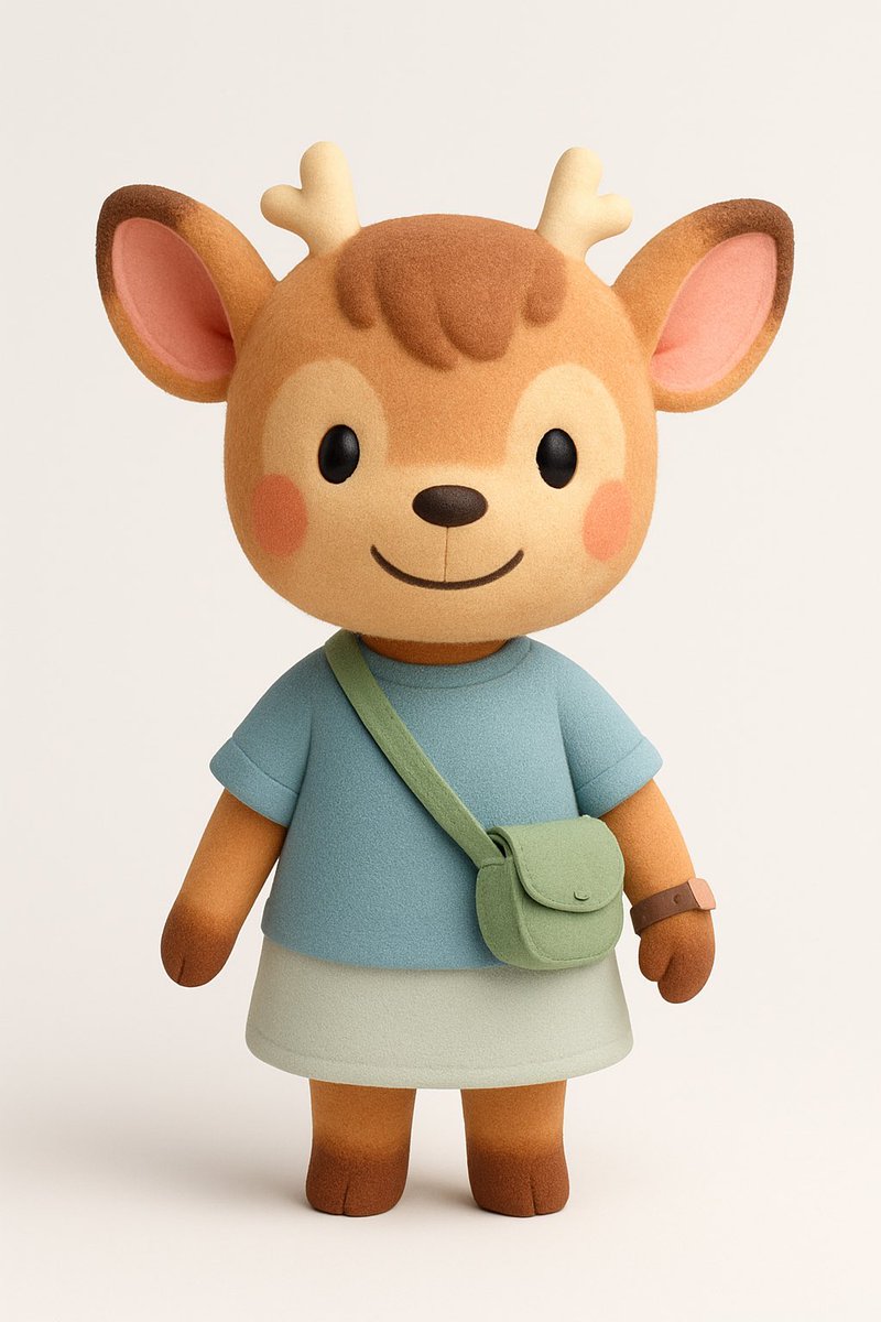 使用柔和的漫射照明和脚下柔和的阴影进行渲染。使用 100% 透明背景(PNG 格式)或非常浅的中性灰色(如果预览)。全身构图,正面或浅色 3/4 视图。保持干净、高分辨率、精美的渲染 — 非常适合角色设计展示或品牌推广。带有大地色调的柔和调色板。