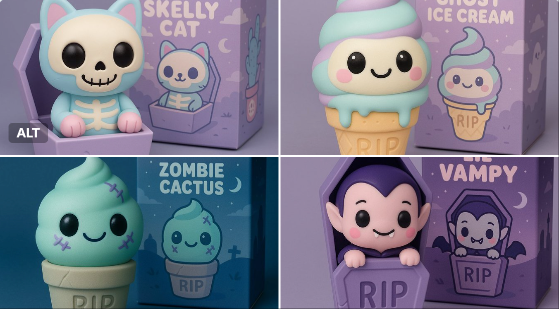 A cute pastel vinyl figure of [INSERT YOUR CHARACTER OR OBJECT], pastel colors (lavender, soft pink, baby blue), kawaii style with big round eyes and friendly smile, simple rounded shapes, stylized “RIP” detail somewhere on the figure or base, matching toy packaging in the background with themed art, studio product photo with soft lighting, minimal shadows