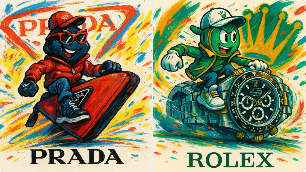 一个形状像 [品牌名称] 商品的虚构人物,穿着反映品牌身份的服装,坐在或骑在该品牌某件商品的超大版本上,就好像它是一辆未来主义的汽车一样。该设计具有富有表现力、充满活力的艺术风格,充满动感和鲜艳的色彩,背景是品牌标志的大型抽象版本。代表品牌的自由绘制元素和颜色散布在整个过程中。背景为浅色,品牌标志出现在底部。外观 1:1