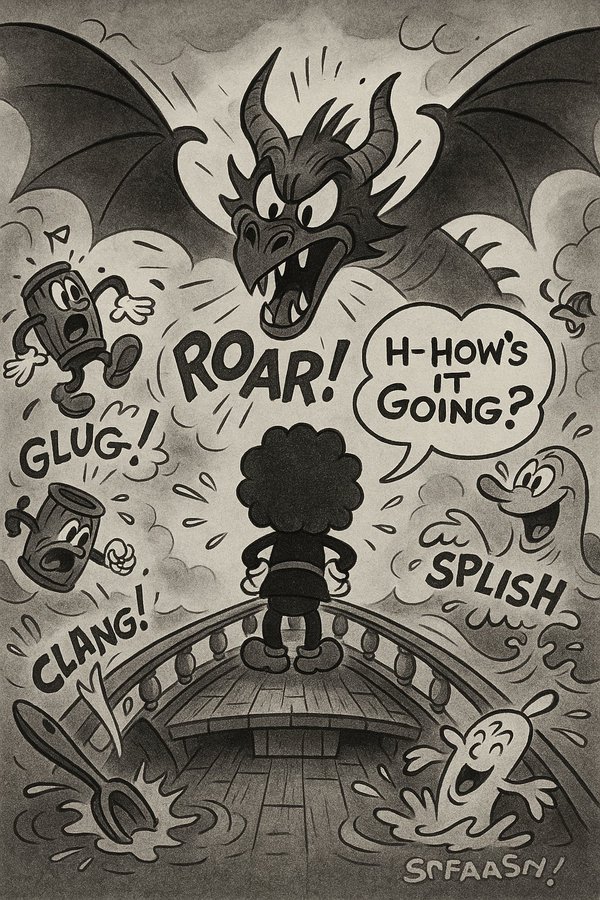 将这张图片转换成20世纪30年代弗莱舍工作室风格的动画分镜。采用灰度色调,搭配富有表现力的墨色阴影和“橡胶管”式肢体线条。场景中要加入拟人化的物体、富有弹性的运动线和闹剧式的动作。整体基调应充满爵士感、活力与趣味。添加手写风格的音效文字和古怪的对话标牌。