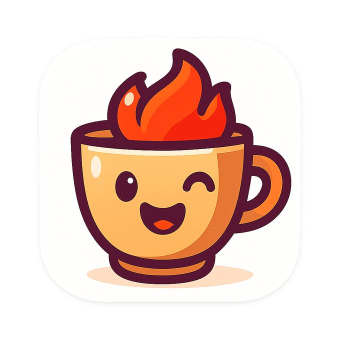 一个俏皮现代的应用程序图标设计:一个可爱的咖啡杯形象,带着眨眼的眼睛和微笑的嘴巴,顶部有橙红色火焰状的“头发”,采用极简扁平矢量风格,带有光泽高光和柔和阴影,构图居中,对比度高,色彩鲜艳,边角圆润,背景透明,适合作为图标使用,无文字,边框外无细节,尺寸为1024x1024。
