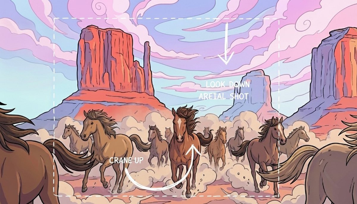 在这张图片上添加草图注释,解释镜头运动。我希望镜头向上摇,然后向下拍摄,形成航拍镜头。