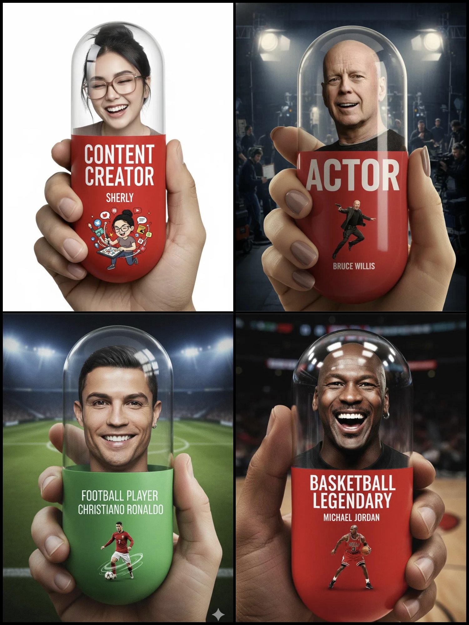 药丸内显示一个人的脸,该人的脸必须与附图100%完全一致——面部结构、比例、表情基线或任何细节都不得更改。该脸必须展现出自然、逼真、开怀大笑的表情。