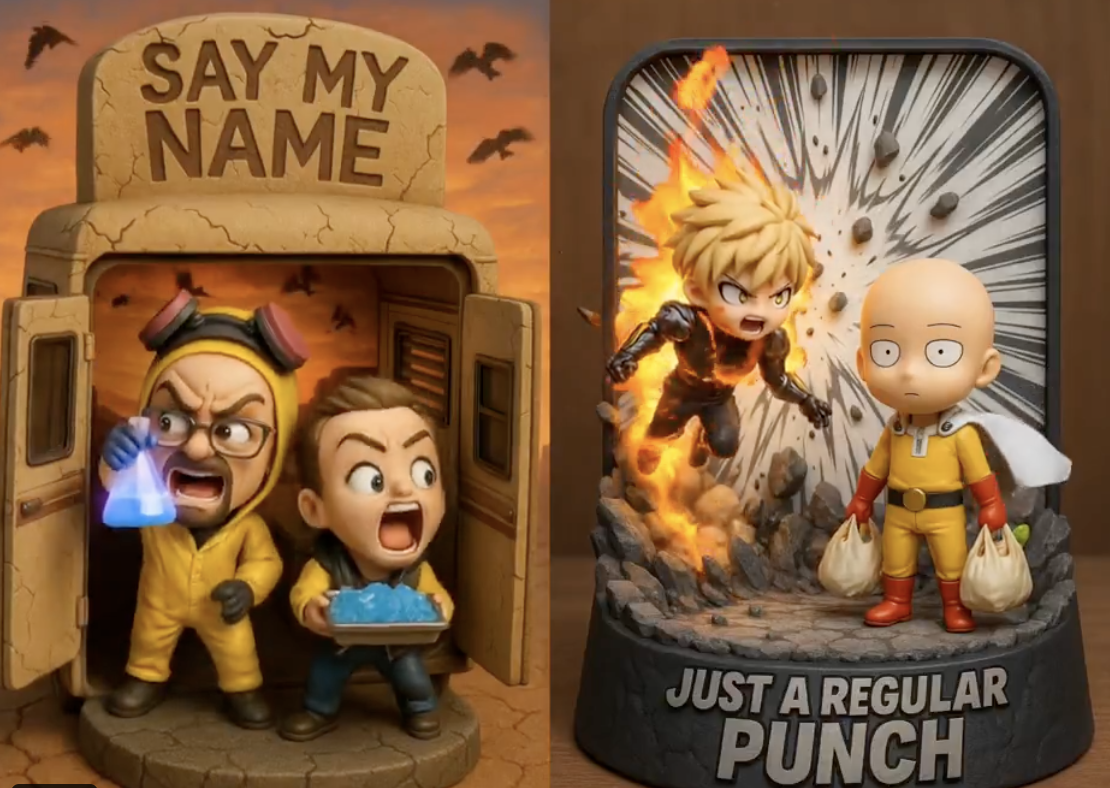 Highly detailed 3D-rendered chibi figurine diorama of [Character A] and [Character B], captured in a [scene/action], inside a [thematic display case shape] with [material]. The background features [visual effects: debris, aura, lightning, scenery], dynamic pose. The title "[custom phrase]" is embossed at the top in [font/style], matching the tone. Lighting is [studio, cinematic, ambient], color palette of [main colors]. Designed in a collectible, stylized, viral-friendly aesthetic.