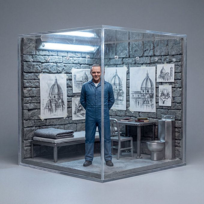 立方体内部是[场景描述:描述特定的标志性电影场景环境。提及关键道具、家具、地板纹理以及使场景易于识别的特定杂物]。