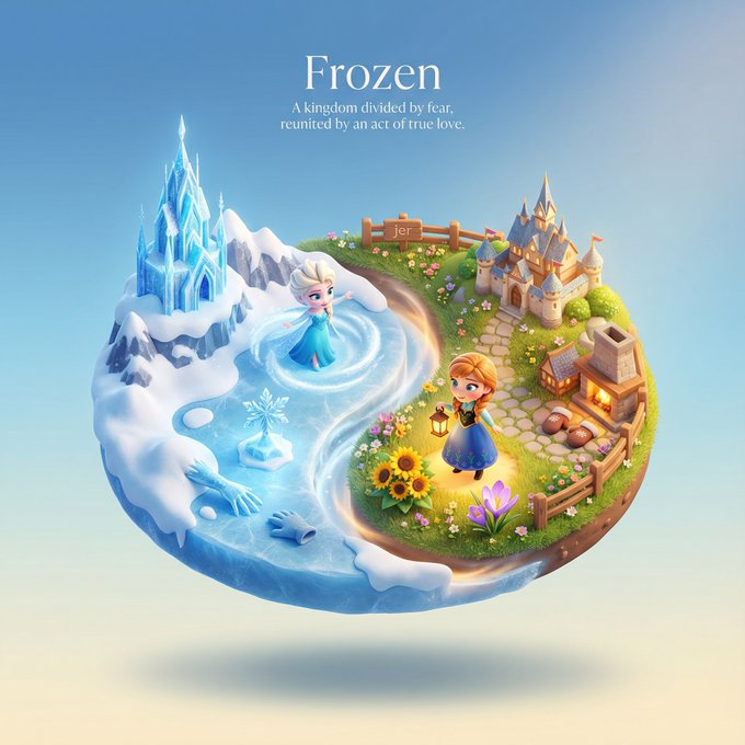 - one swirling half of the circle shows [Subject]'s most iconic defining scene or aspect (primary realm).