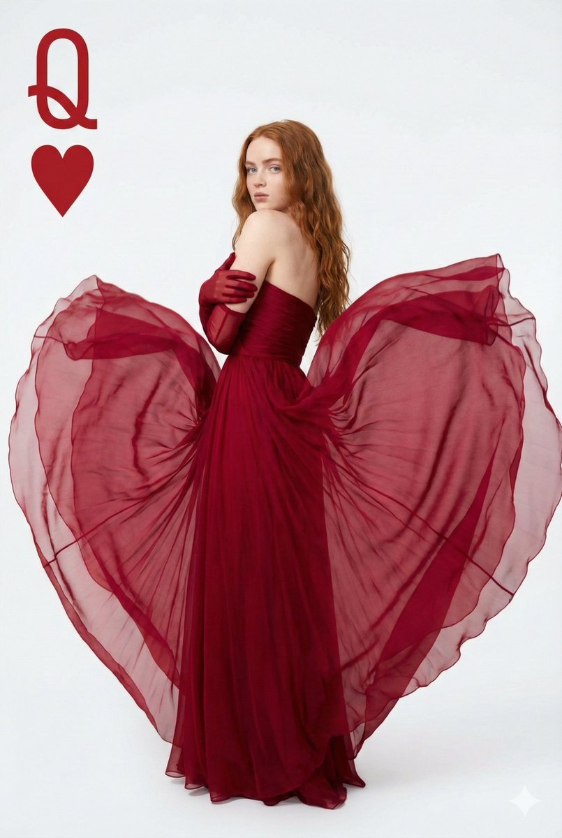 高保真、忠于原图的面部复制。从用户提供的图像中,100% 保持原始人物的面部相似度和身份。用户的原始照片仅用于身份参考。您绝不能以任何方式改变、增强或风格化主体的面部结构。这包括但不限于:不要改变脸颊、鼻子、眼睛或下颌线的形状。避免任何“玩偶般”或理想化的特征。面部复制必须完美。您必须用下面描述的新风格替换原始姿势、服装和背景。应用以下风格: 为主体应用纤细、优雅的体型。图像是高概念时尚影棚肖像,以“红心皇后”扑克牌为主题,呈纵向构图,宽高比为 4:5。主体留着波浪状的深褐色长发,松散地披散在背部。主体以中景拍摄,身体背对镜头,扭动躯干,越过左肩直接看向镜头。姿势内敛而优雅,双臂交叉在胸前,环抱紧身胸衣。主体身穿一件华丽的深绯红色无肩带礼服。最关键的风格元素是对礼服面料的处理:大量透明、半透明的红色雪纺或欧根纱层在主体身后向外飘逸、翻腾,被塑造成一个完美、蓬松的心形,占据了整个画面。面料捕捉光线,展现出纹理、褶皱和不同程度的透明度,从阴影中的深宝石红到光线照射到透明层时的亮樱桃红。主体还戴着与红色礼服无缝融合的配套哑光红色歌剧式长手套,手套延伸至肘部以上。灯光是柔和、漫射的高调影棚灯光,均匀照亮主体并产生柔和的阴影,强调心形面料的三维感。背景是干净、纯白的无缝背景,与红色的主体形成强烈对比。存在一个特定的图形元素:在左上角,一个大的红色衬线大写字母“Q”直接位于一个红色红心花色符号上方,模仿扑克牌的索引。整体美学是浪漫、精致和具有杂志风格的。