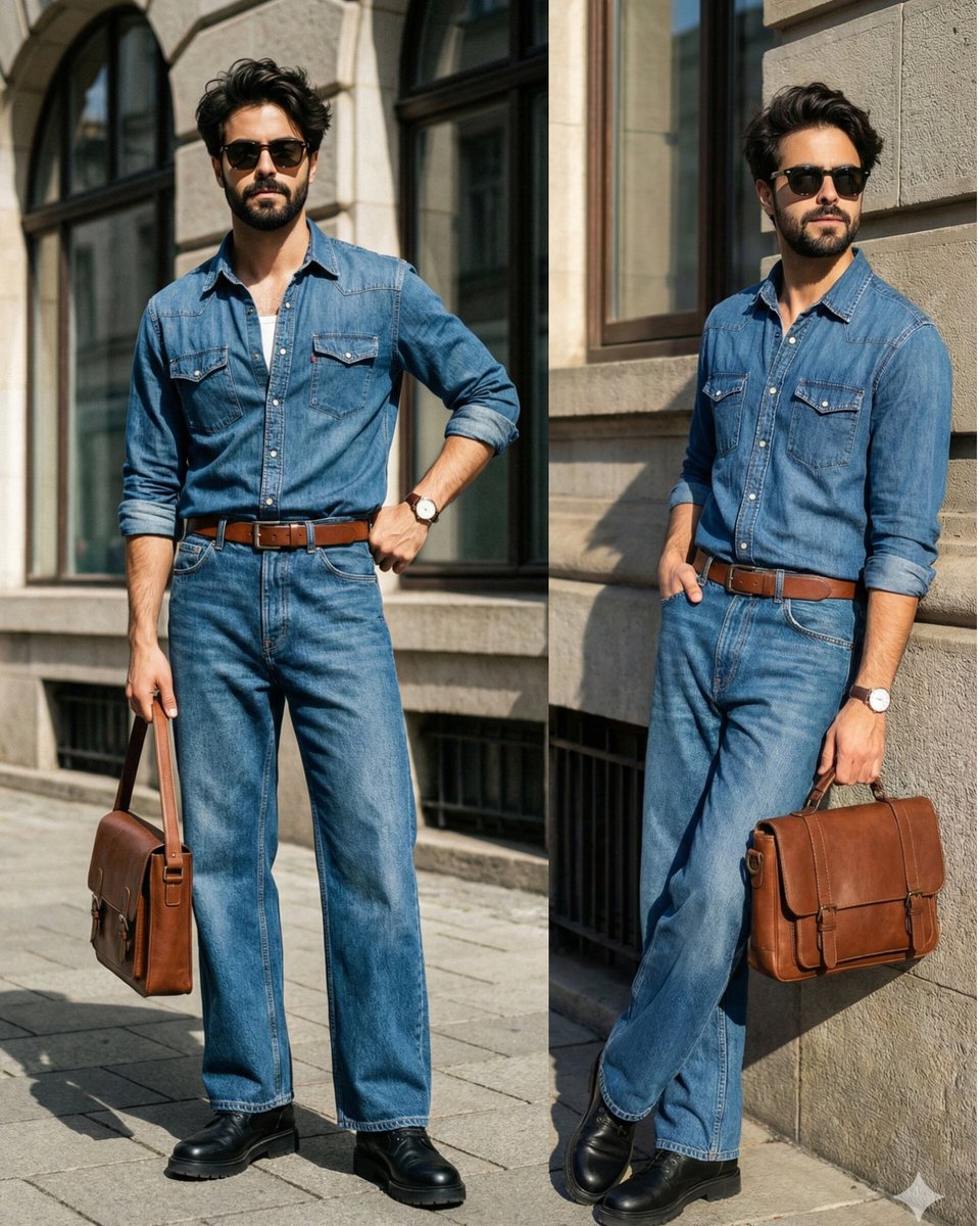 Subject: A stylish man [100% real face from uploaded image ] with messy dark hair and a broomed beard, wearing dark sunglasses. He exudes a cool, vintage-inspired street fashion vibe. Outfit: A full denim-on-denim ensemble. He is wearing a blue denim button-down shirt with sleeves rolled up to the elbows, tucked into high-waisted, wide-leg blue denim jeans. A brown leather belt cinches the waist. A white undershirt is slightly visible at the neckline. He wears chunky black leather boots. Accessories: He holds a rectangular brown leather satchel/clutch bag in his left hand by its strap. He wears a classic wristwatch on his left wrist. Pose: Standing confidently on a paved walkway, with his right hand resting on his hip and his left arm relaxed by his side holding the bag. Background: An elegant urban exterior featuring a stone building facade with large, classic arched windows and beige/brown brickwork. Sunlight casts natural, sharp shadows on the ground, indicating a bright daytime setting. Technical Specifications: 8k resolution, hyper-realistic, cinematic lighting, shot on 35mm film, incredibly detailed textures (denim fabric, leather grain, stone texture), depth of field, sharp focus, photorealistic street style photography, fashion editorial look.