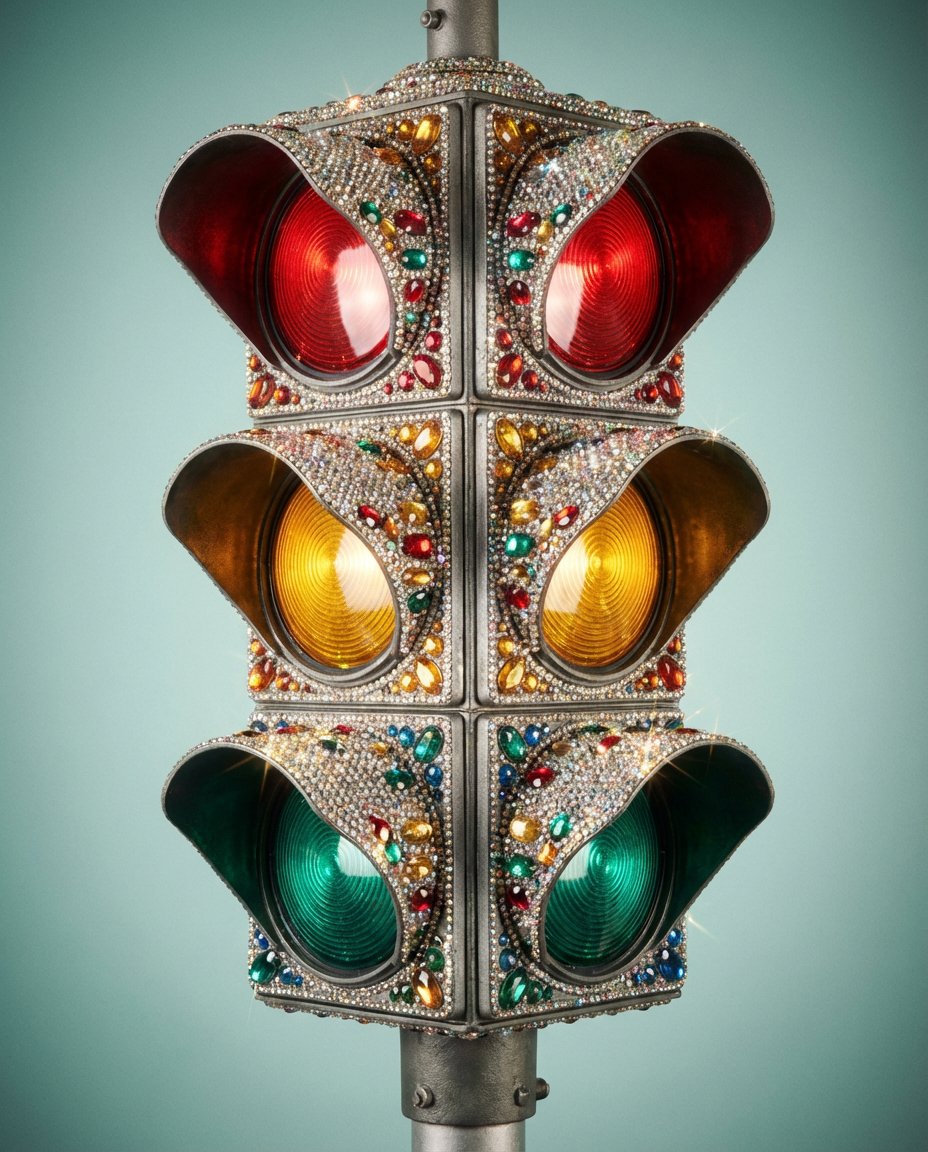一个高度细致的特写镜头,展示了一个复古交通信号灯,每个金属和塑料表面都奢华地镶嵌着闪闪发光的水钻、水晶和彩色宝石,而红色、黄色和绿色的灯罩则保持完美清晰。整体氛围柔和复古,带有轻微的胶片颗粒感,宝石上反射着微妙的光芒和闪烁的亮点。构图居中,背景是平滑的浅青色,带有轻微的渐晕效果。柔和的漫射摄影棚灯光强调了纹理和光泽。