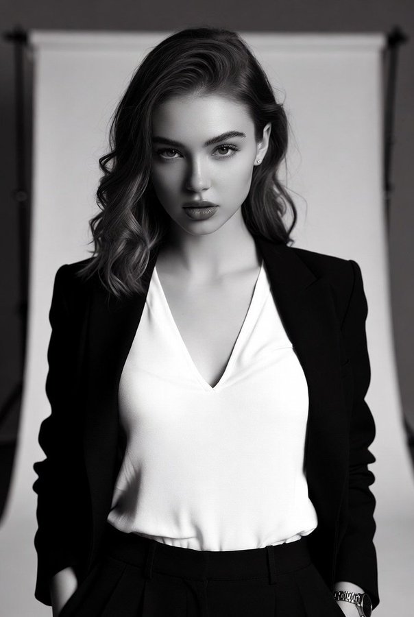 "prompt": "创建一幅高对比度的黑白时尚肖像,主体为一位时尚的年轻女性。必须严格使用上传的参考图作为她的面部、身份和面部结构——不得做任何改动。她身穿剪裁合身的黑色西装外套,内搭修身白色衬衫,配高腰西裤。配饰极简:仅一块简约银色腕表与小颗耳钉。头发造型完美,柔波轻抚面庞。姿态:自信直视,肩膀放松,优雅挺拔。灯光:戏剧性影棚灯,锐利高光与深邃阴影塑造面部与服饰轮廓。背景:干净无缝白色影棚背景,带微妙灰阶渐变。氛围:杂志感、力量感、高端《Vogue》美学。相机:85mm镜头,浅景深,面料与皮肤纹理超写实,DSLR级清晰度。风格:电影感黑白、高对比、极致细节、专业时尚大刊、8K分辨率。",