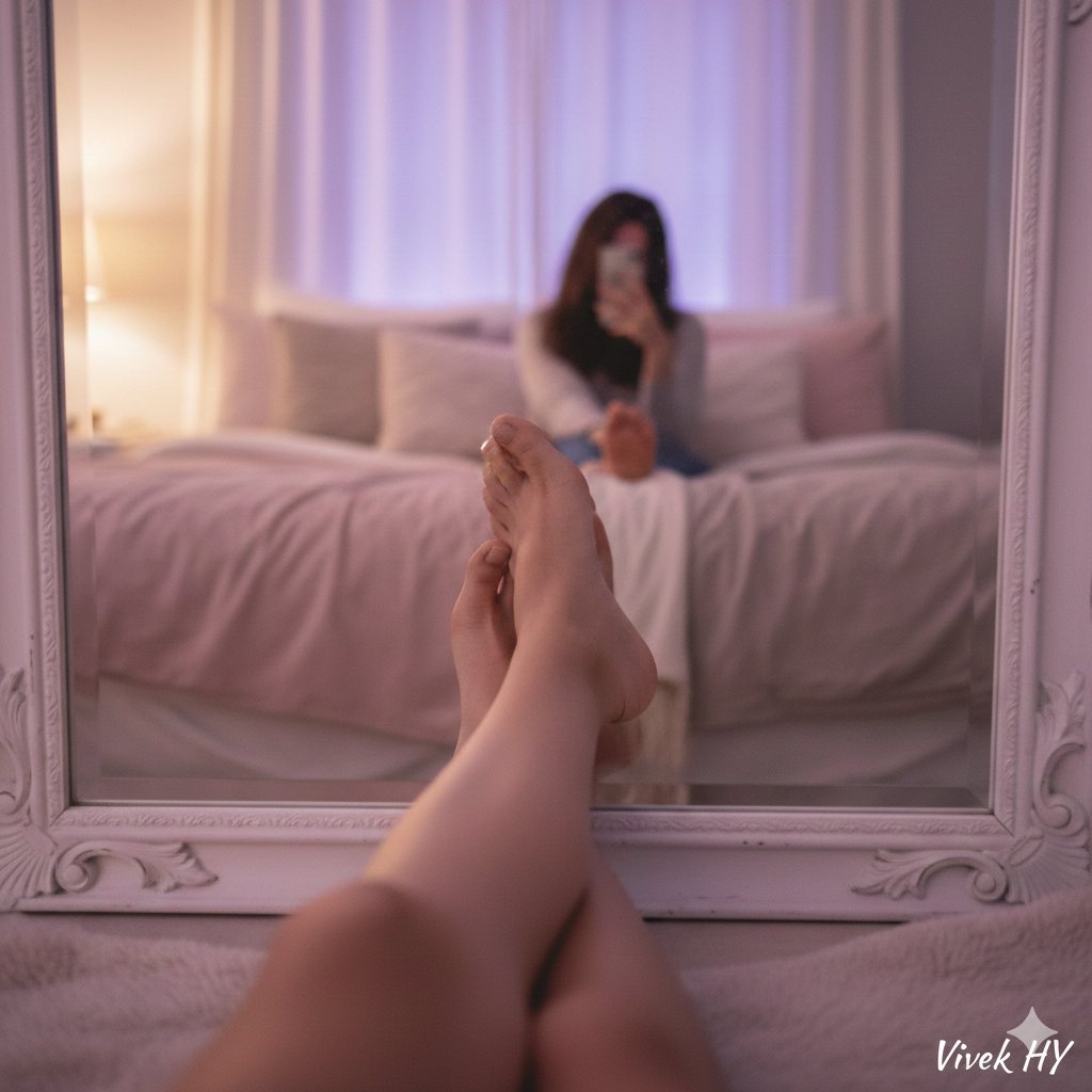 <span>{ "prompt_id": "mirror_pose_014", "description": "A soft, aesthetic mirror-reflection photo with legs and feet in the foreground", "scene": { "environment": "Cozy bedroom with pastel tones, soft bedding and gentle ambient lighting", "lighting": "Warm, diffused light with a subtle purple glow in the background", "camera": { "type": "smartphone", "angle": "low angle from the feet, capturing reflection in an ornate white mirror", "focus": "sharp foreground feet, slightly softer background" } }, "subject": { "pose": "Person sitting on the bed with legs stretched toward the mirror, holding a phone while taking a reflection selfie", "details": "Natural skin texture, clean nails, relaxed feet pose, no face visible" }, "aesthetics": { "style": "soft, dreamy, cozy minimalism", "colors": ["pastel pink", "soft beige", "lavender glow"], "vibe": "calm, intimate, aesthetic" }, "extras": { "texture": "realistic skin, smooth gradients", "mirror_frame": "white ornate, lightly detailed", "signature": "Add '</span><span class="bg-blue-200 text-blue-800 px-1.5 py-[1px] border border-black font-bold">Vivek HY</span><span>' in small elegant font in the bottom right corner" } }</span>json { "prompt_id": "mirror_pose_014", "description": "一张柔和、唯美的镜面反射照片,前景是腿和脚", "scene": { "environment": "舒适的卧室,配有柔和的色调、柔软的床上用品和温馨的环境照明", "lighting": "温暖、漫射的光线,背景带有微妙的紫色光晕", "camera": { "type": "智能手机", "angle": "从脚部低角度拍摄,捕捉华丽白色镜子中的反射", "focus": "前景的脚部清晰,背景略微柔和" } }, "subject": { "pose": "人物坐在床上,双腿伸向镜子,手持手机拍摄反射自拍", "details": "自然的皮肤纹理,干净的指甲,放松的脚部姿势,脸部不可见" }, "aesthetics": { "style": "柔和、梦幻、舒适的极简主义", "colors": ["柔和粉", "柔和米色", "薰衣草光晕"], "vibe": "平静、私密、唯美" }, "extras": { "texture": "逼真的皮肤,平滑的渐变", "mirror_frame": "白色华丽,细节轻微", "signature": "在右下角添加小巧优雅的字体“{argument name=\"signature text\" default=\"Vivek HY\"}”" } }