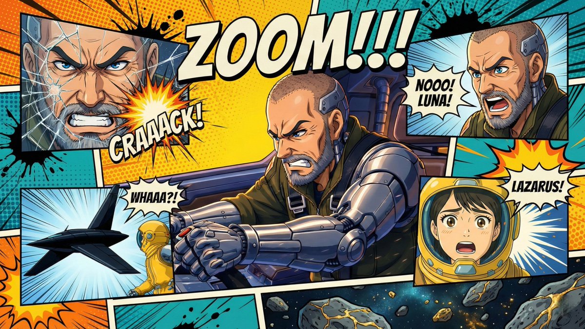 { "image_type": "comic_poster_illustration", "reference_image": { "use": true, "identity_preservation": "strict", "face_similarity": "high", "no_face_morphing": true }, "canvas": { "aspect_ratio": "16:9", "resolution": "4K", "orientation": "horizontal poster" }, "title_text": { "text": "ZOOM!!!", "position": "top_center", "style": "bold comic title lettering", "font_look": "thick hand-drawn comic font", "color": "cream white with black outline", "effects": [ "slight 3D emboss", "comic ink shadow", "subtle halftone texture" ] }, "main_character": { "subject": "spacecraft and pilot with metallic implant using my first reference image", "pose": "angry heroic", "style": "modern space miner hero" }, "lighting": "dramatic comic-style rim lighting", "render_style": "healing Japanese Anime comic illustration" }, "comic_panels": [ { "position": "top_left", "pose": "Extreme close-up from behind spiderwebbed glass", "expression": "Angry", "panel_effect": "burst explosion background" "panel_effect": "comic sound effect craaack" }, { "position": "top_right", "subject": "pilot with metallic implant using my first reference image", "pose": "mouth open eyes wide", "speech_text": "NOOO!", "expression": "Worried", "speech_text": "LUNA!", }, { "position": "bottom_left", "subject": "spacecraft and astronaut using my second reference image", "pose": " profile of a small black ship facing frame left with a pointed nose sleek narrow fuselage swept down delta wings a single rear jet engine and a single tall rear tail fin and astronaut looking at it", "speech_text": "WHAAA?!", "motion_lines": true }, { "position": "bottom_right", "subject": "spacecraft and pilot with metallic implant using my third reference image", "expression": "scared", "speech_text": "LAZARUS!", "panel_effect": "starburst" } ], "background": { "style": "comic book panels collage", "colors": [ "orange", "yellow", "blue", "teal" ], "elements": [ "halftone dots", "ink splashes", "dynamic action lines", "comic explosion shapes" ], "bottom_scene": "asteroid field with gold veins in the asteroids" }, "art_style": { "genre": "modern comic book / graphic novel", "influences": [ "Marvel comic covers", "DC character posters", "Pop-art illustration" ], "line_work": "clean b"{ "image_type": "comic_poster_illustration", "reference_image": { "use": true, "identity_preservation": "strict", "face_similarity": "high", "no_face_morphing": true }, "canvas": { "aspect_ratio": "16:9", "resolution": "4K", "orientation": "horizontal poster" }, "title_text": { "text": "{argument name=\"title text\" default=\"ZOOM!!!\"}", "position": "top_center", "style": "bold comic title lettering", "font_look": "thick hand-drawn comic font", "color": "cream white with black outline", "effects": [ "slight 3D emboss", "comic ink shadow", "subtle halftone texture" ] }, "main_character": { "subject": "{argument name=\"main subject\" default=\"spacecraft and pilot with metallic implant using my first reference image\"}", "pose": "angry heroic", "style": "modern space miner hero", "lighting": "dramatic comic-style rim lighting", "render_style": "healing Japanese Anime comic illustration" }, "comic_panels": [ { "position": "top_left", "pose": "Extreme close-up from behind spiderwebbed glass", "expression": "Angry", "panel_effect": "burst explosion background", "panel_effect": "comic sound effect craaack" }, { "position": "top_right", "subject": "pilot with metallic implant using my first reference image", "pose": "mouth open eyes wide", "speech_text": "NOOO!", "expression": "Worried", "speech_text": "LUNA!" }, { "position": "bottom_left", "subject": "spacecraft and astronaut using my second reference image", "pose": " profile of a small black ship facing frame left with a pointed nose sleek narrow fuselage swept down delta wings a single rear jet engine and a single tall rear tail fin and astronaut looking at it", "speech_text": "WHAAA?!", "motion_lines": true }, { "position": "bottom_right", "subject": "spacecraft and pilot with metallic implant using my third reference image", "expression": "scared", "speech_text": "LAZARUS!", "panel_effect": "starburst" } ], "background": { "style": "comic book panels collage", "colors": [ "orange", "yellow", "blue", "teal" ], "elements": [ "halftone dots", "ink splashes", "dynamic action lines", "comic explosion shapes" ], "bottom_scene": "asteroid field with gold veins in the asteroids" }, "art_style": { "genre": "modern comic book / graphic novel", "influences": [ "Marvel comic covers", "DC character posters", "Pop-art illustration" ], "line_work": "clean b" } }
